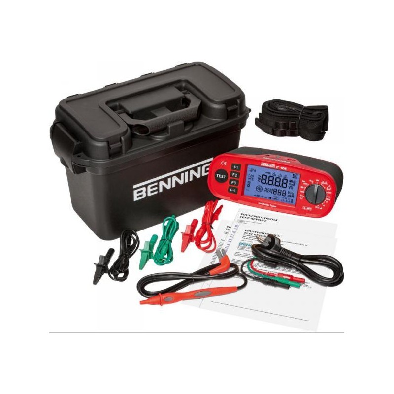 Tester instalacji IT 105 Wykonanie: obudowa z odpornego na uderzenia tworzywa sztucznego, wyświetlacz graficzny z podświetleniem.Zastosowanie: do kontroli bezpieczeństwa instalacji elektrycznych zgodnie z DIN VDE 0100-600 i DIN VDE 0105-100.Dostawa: tester instalacji, z kablem pomiarowym i wtyczką ze stykiem ochronnym, 3 końcówkami pomiarowymi, 3 zaciskami krokodylkowymi i certyfikatem kalibracji. IT 105. Testowanie wyłącznika ochronnego FI/RCD standardowego i opóźnionego (S) typ AC, A z testem AUTO. Dostawa z paskiem na ramię i walizką ze wzmocnioną pokrywą i dnem.