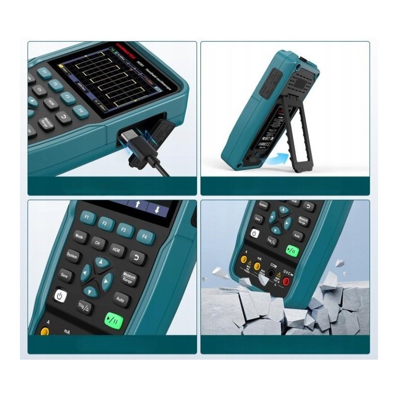 Oscyloskop charakteryzuje się lekką i przenośną konstrukcją, ważącą zaledwie 0,5 kg oraz wymiarami 198 mm x 100 mm x 39 mm. Duży kolorowy wyświetlacz o przekątnej 3,5 cala z przyjaznym interfejsem zapewnia wyraźną i intuicyjną obsługę, co czyni go idealnym rozwiązaniem dla początkujących.