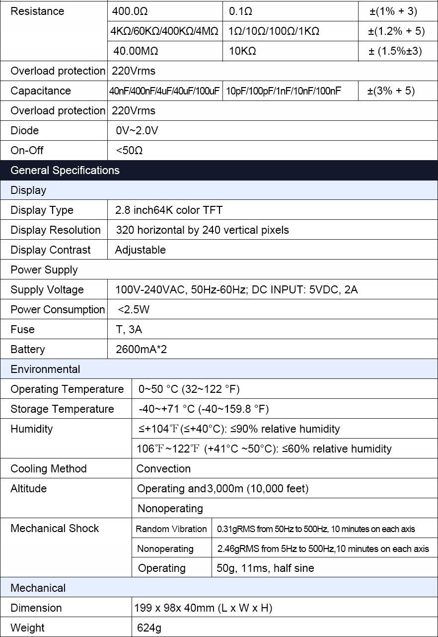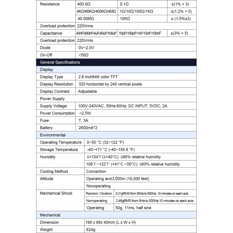 Urządzenie jest wyposażone w cyfrowy multimetr (DMM) z maksymalnym wskazaniem 4000, co pozwala na dokładne pomiary napięcia, prądu oraz oporu. Dzięki temu Hantek 2C42 staje się wszechstronnym narzędziem, które zaspokaja różnorodne potrzeby pomiarowe.
