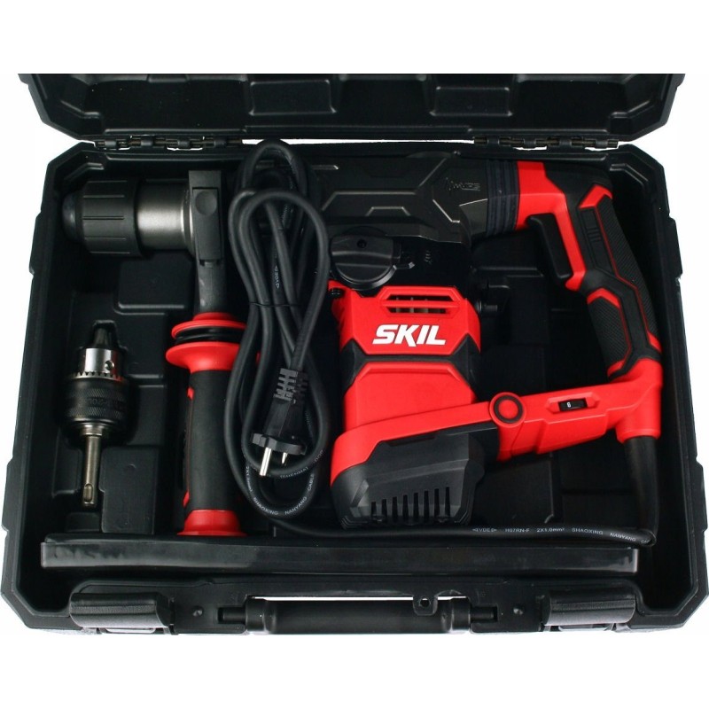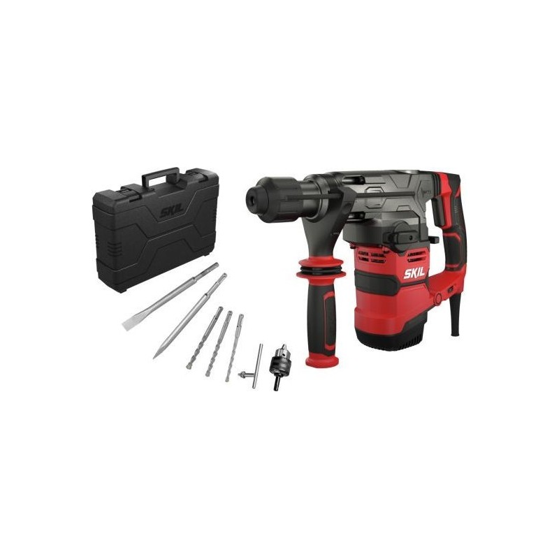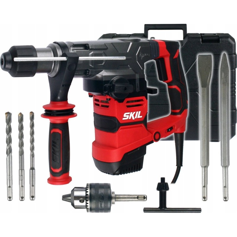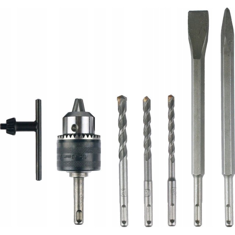 W standardowym wyposażeniu znajduje się młot udarowo-obrotowy, solidna walizka, wiertła SDS+ (8, 10, 12 mm), dłuto szpicak oraz płaskie, adapter SDS+ z uchwytem wiertarskim 13 mm, antywibracyjna rączka boczna oraz ogranicznik głębokości wiercenia. Dzięki temu, użytkownik ma wszystko, co potrzebne do rozpoczęcia pracy od razu po zakupie.