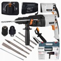 W zestawie z młotem udarowym znajdują się trzy wiertła SDS do betonu o średnicach 6, 8 i 10 mm oraz dwa dłuta (punktowe i płaskie), co zapewnia pełną gotowość do pracy w różnych materiałach.