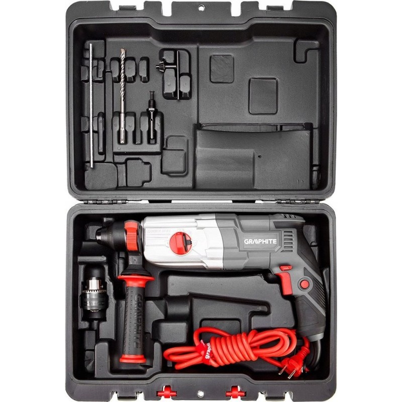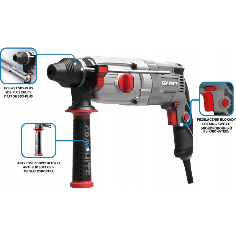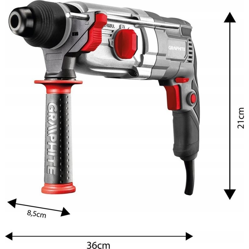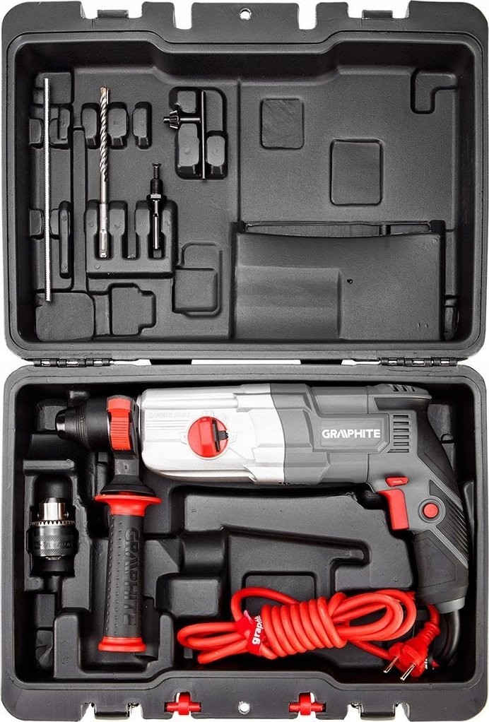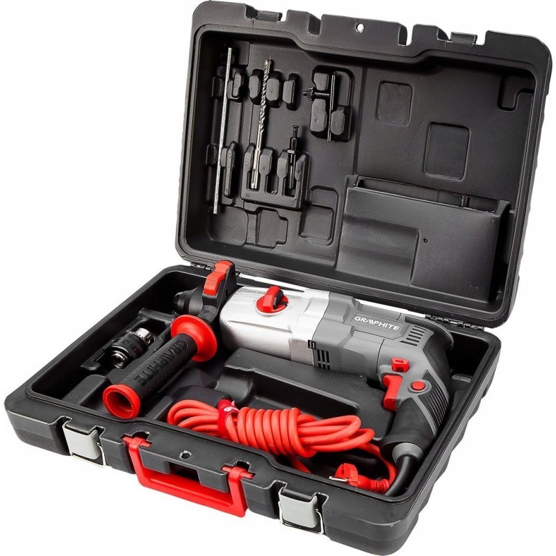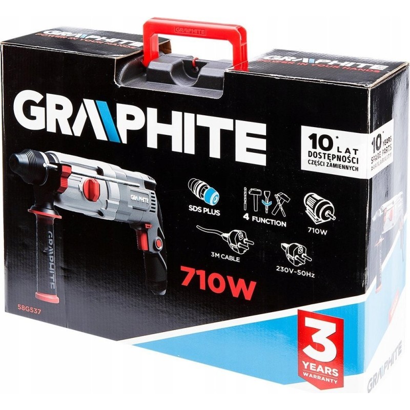 Młotowiertarka SDS+ 710 W, 2,6J, walizka 58G537 GRAPHITE to nowoczesne narzędzie klasy SDS+, cechujące się mocą 710 W. Solidna, czterofunkcyjna młotowiertarka polecana jest do różnorodnych prac budowlanych, montażowych i instalacyjnych. Oferuje: