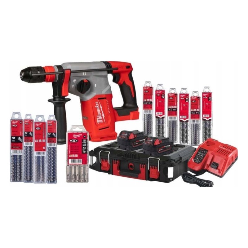 - Młotowiertarka M18BLHX - 2 x Akumulator 5.0Ah - Ładowarka M12-18FC - Walizka Packout - 30 x Wiertło SDS-Plus MX4 6x165mm - 30 x Wiertło SDS-Plus MX4 8x165mm - 10 x Wiertło SDS-Plus MX4 10x215mm - 10 x Wiertło SDS-Plus MX4 12x210mm - 10 x Wiertło SDS-Plus MX4 12x260mm - Zestaw wierteł SDS-Plus 4932352833