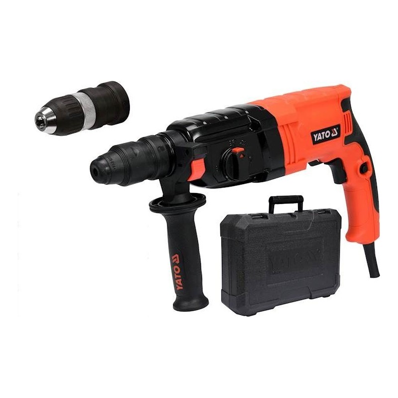 Uniwersalna młotowiertarka umożliwiająca wiercenie w każdym rodzaju materiału, dzięki dwóm samozaciskowym głowicom. Sprawdza się przy wierceniu pod puszki elektryczne, podkuwaniu bruzd pod kable oraz wierceniu bez udaru przy użyciu głowicy 13 mm. Duża siła i prędkość obrotowa zapewniają szybki postęp prac. Urządzenie posiada metalową obudowę całej przekładni. Stalowe sprzęgło zabezpiecza użytkownika przed przeciążeniem i urazem. Urządzenie posiada system szybkiej wymiany głowic. Boczne pokrętło pozwala wybrać ustawienia trybu pracy: kucie, wiercenie, wiercenie z udarem lub pozycjonowanie dłuta. Gruby kabel 3 m. W komplecie dodatkowa głowica 13 mm, 3 wiertła i 2 dłuta. Zapakowana w trwałą walizkę z metalowymi zatrzaskami.