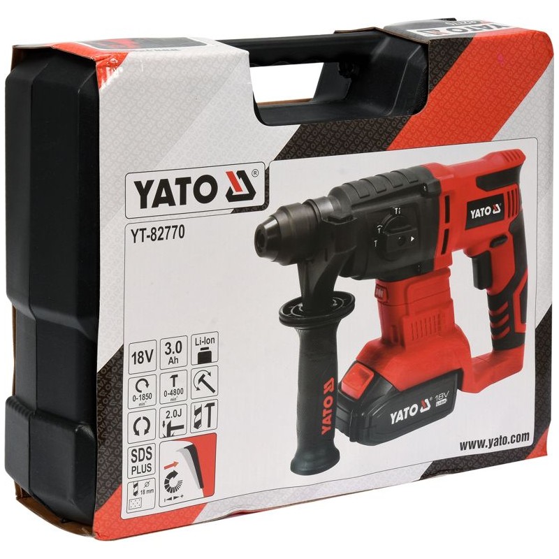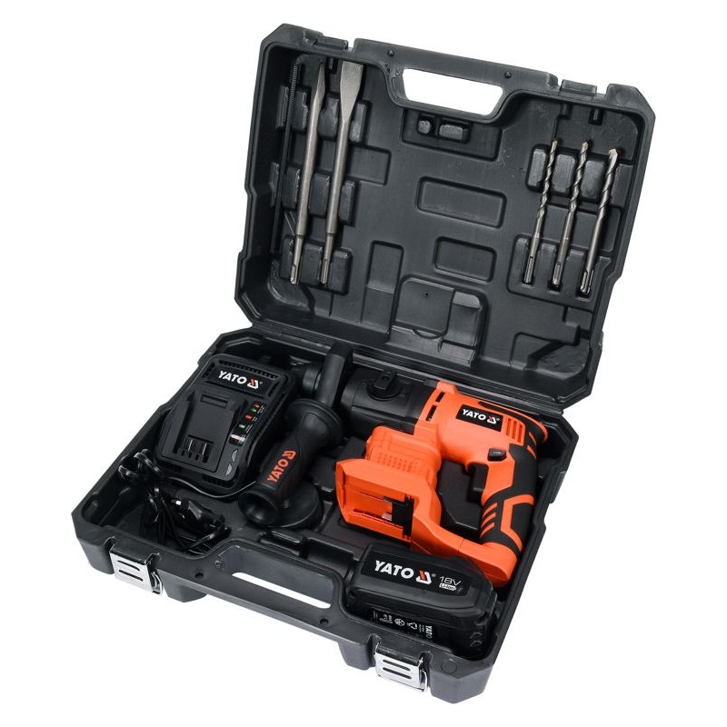 Lekka i ergonomiczna akumulatorowa młotowiertarka SDS-plus YATO zfunkcją podkuwania. Dzięki niewielkiej wadze, krótkiemu korpusowi i zasilaniu wytrzymałą baterią doskonale sprawdzi się podczas montażu sufitów podwieszanych i seryjnego wiercenia w betonie. Polecana dla instalatorów, elektryków.