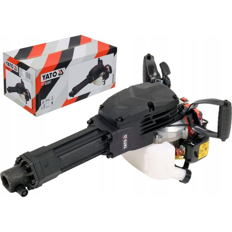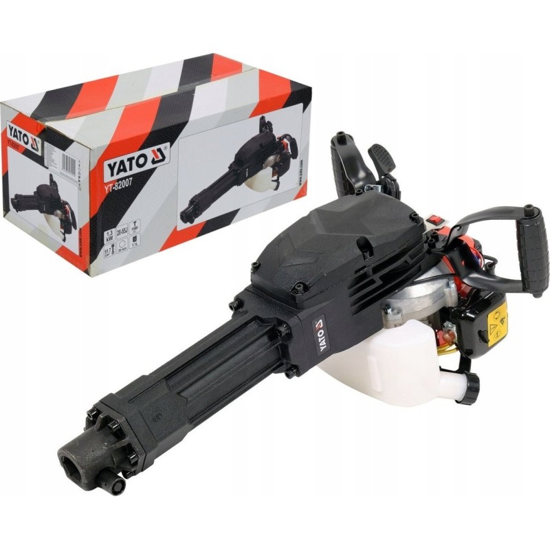 Młot wyburzeniowy napędzany silnikiem spalinowym dwusuwowym. Konstrukcja waży 11kg i dzięki temu praca urządzeniem jest wygodna. Siła udaru 55J sprawnie kruszy beton zbrojony stosowany w fundamentach i kamień naturalny. Niewielkie zużycie paliwa (0,9L/mth) czyni urządzenie bardzo ekonomicznym. W przeciwieństwie do młotów elektrycznych nie ma konieczności stosowania ciężkich agregatów prądotwórczych, których waga wynosi co najmniej 40kg co wymaga pracy w zespole dwuosobowym. Młot YT-82007 bez większego wysiłku obsługuje jedna osoba. Oprócz funkcji dłutowania, młot tego typu ma możliwość pracy jako skoczek do zagęszczania gruntu (pasuje stopa hex 30mm YT-47385)