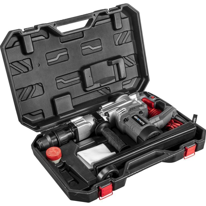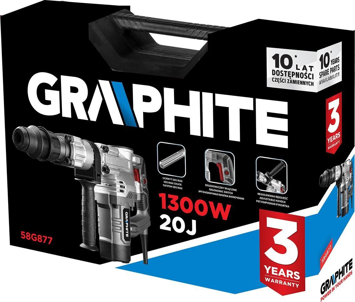 Posiada funkcję dłutowania oraz tryb indeksacja dłuta. Wyposażone jest w system SDS-max, charakteryzujący się pracą z twardymi materiałami. Młot posiada 4 metrowy przewód zasilający. Oferowany jest w praktycznej walizce z zestawem akcesoriów: dłutem i smarem do wrzecion. To doskonałe urządzenie od marki Graphite dla profesjonalistów.