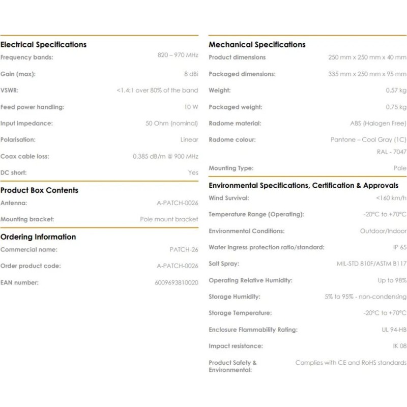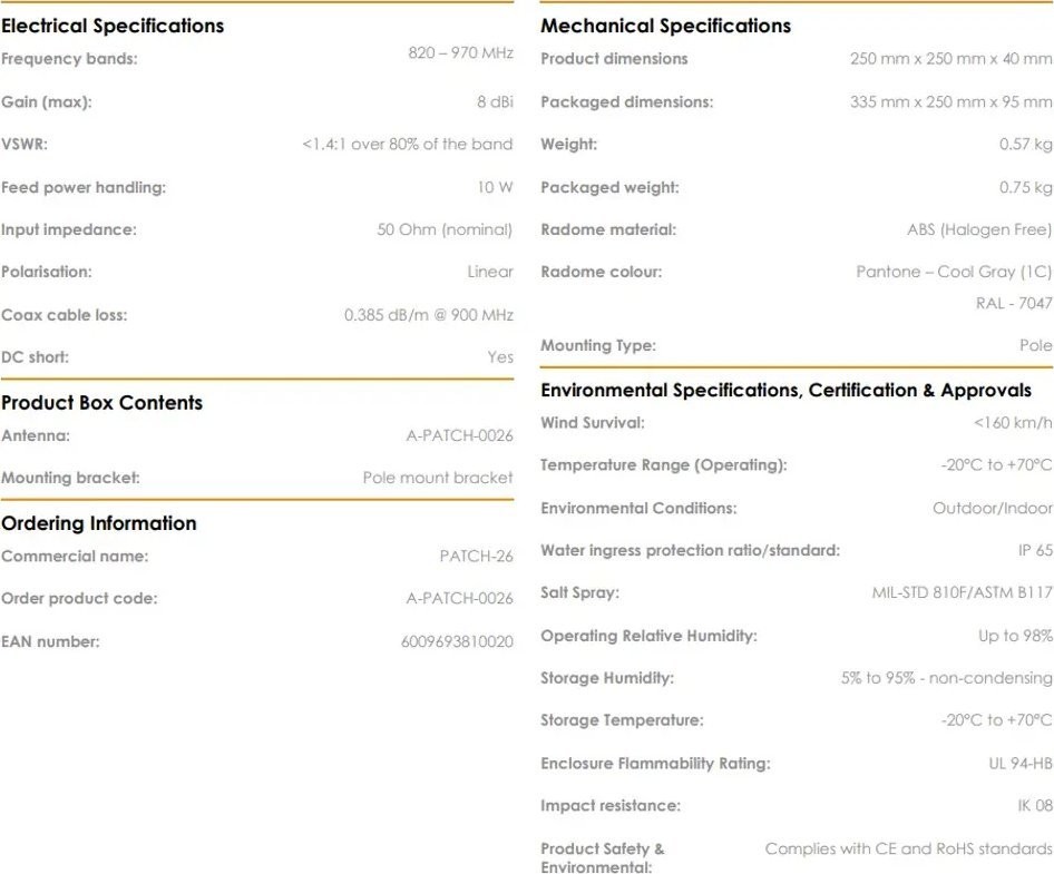 Obudowa anteny Poynting PATCH-26 została stworzona z myślą o odporności na niekorzystne warunki atmosferyczne oraz uszkodzenia mechaniczne. Klasa ochrony IP65 zapewnia, że antena będzie działać niezawodnie w różnych środowiskach, zarówno miejskich, jak i wiejskich.