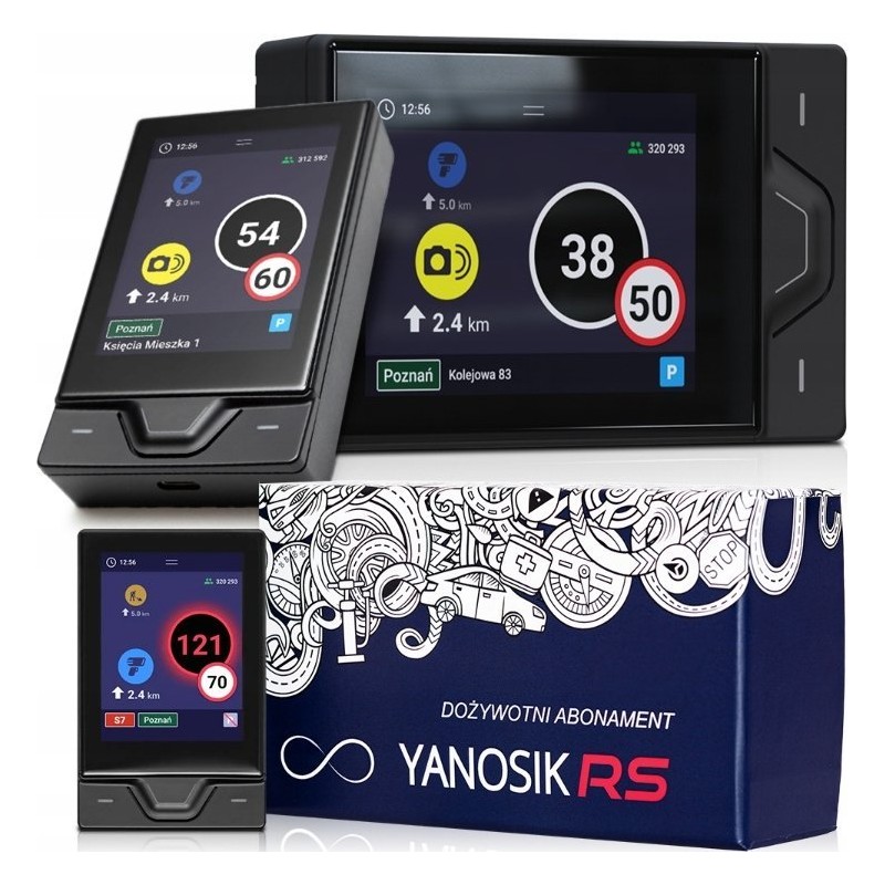 - Zawartość zestawu: Urządzenie Yanosik RS, kabel zasilający USB typ-C, adapter do gniazda ładowarki, instrukcja obsługi, karta gwarancyjna