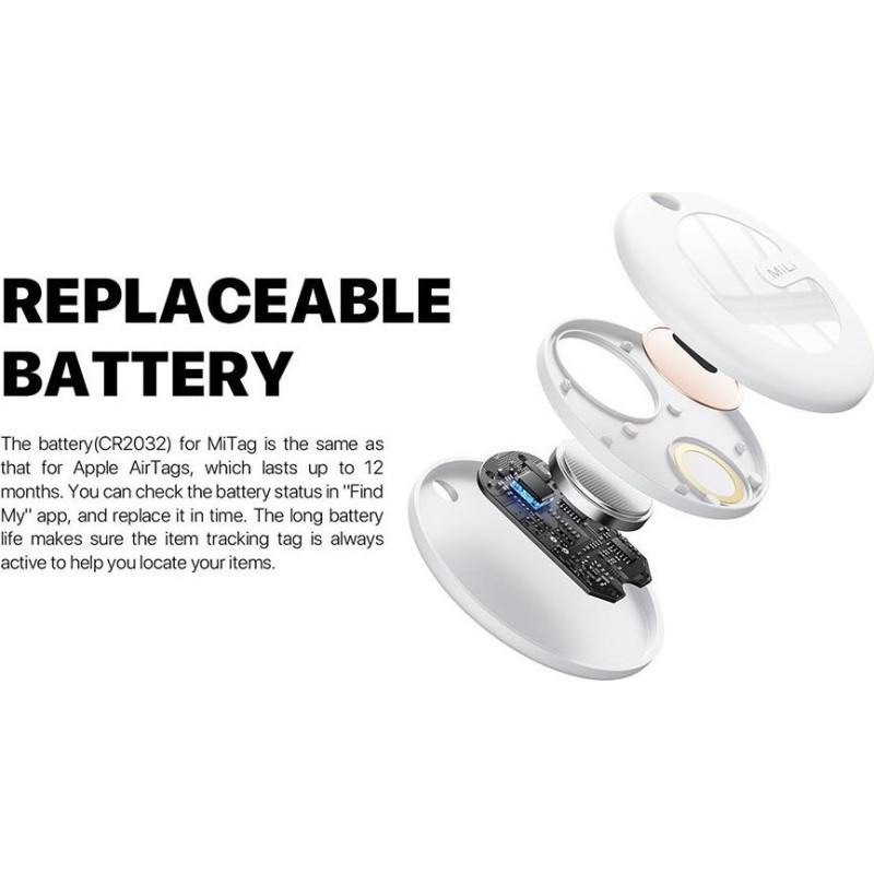 Bateria, która wytrzymuje cały rok użytkowania? Z MiTagiem nie ma rzeczy niemożliwych MiTag, podobnie jak Apple AirTag, współpracuje z wymienną baterią CR2032. Możesz na bieżąco sprawdzać jego stan w aplikacji i wymienić go na nowy, zanim skończy się jego żywotność. Długa żywotność sięgająca 12 miesięcy sprawia, że MiTag jest zawsze aktywny podczas śledzenia obiektów i gotowy do pomocy w ich odnalezieniu. W zestawie znajduje się także jedna bateri