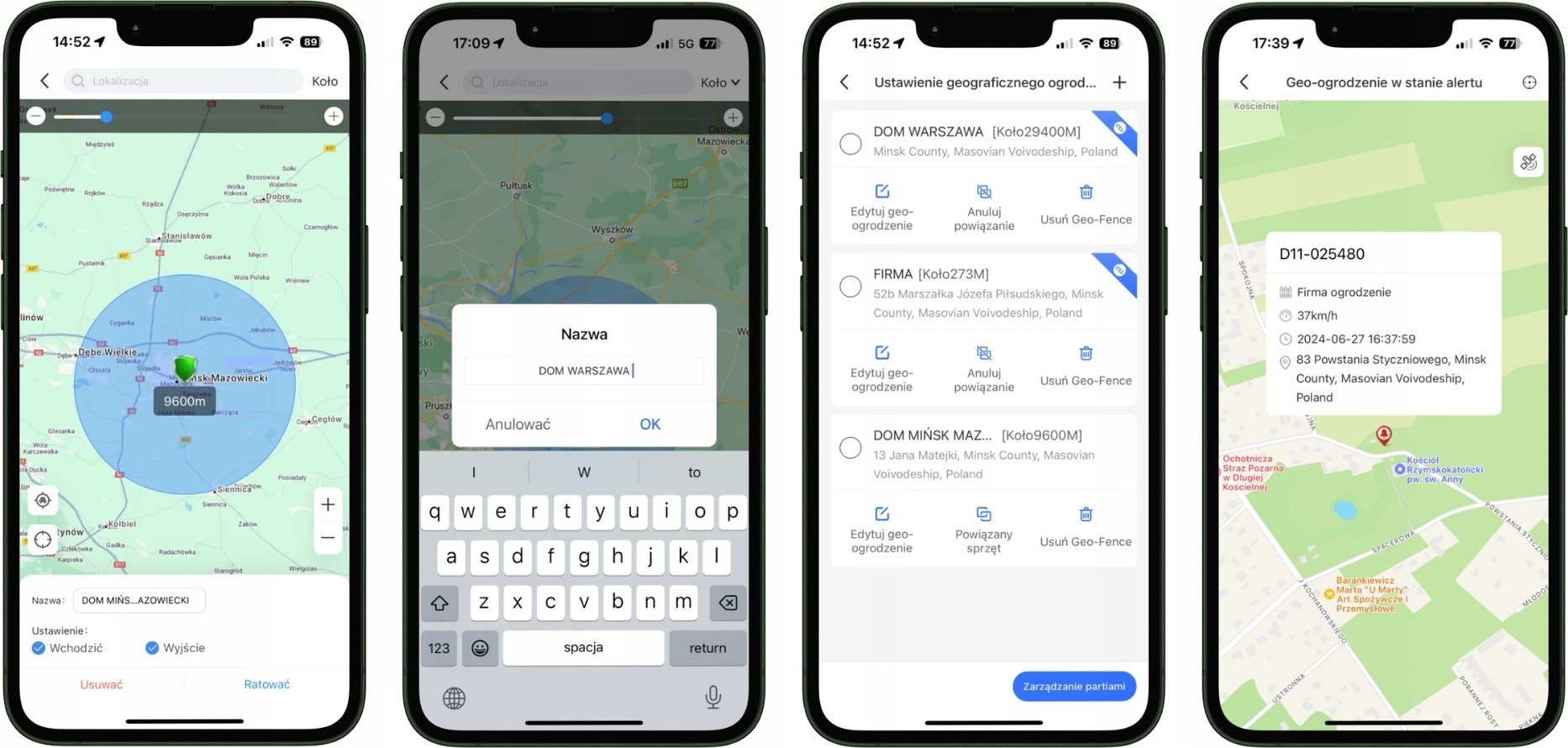 - Alarm przekroczenia wyznaczonego obszaru: Alerty o opuszczeniu lub wjechaniu do zdefiniowanego obszaru.