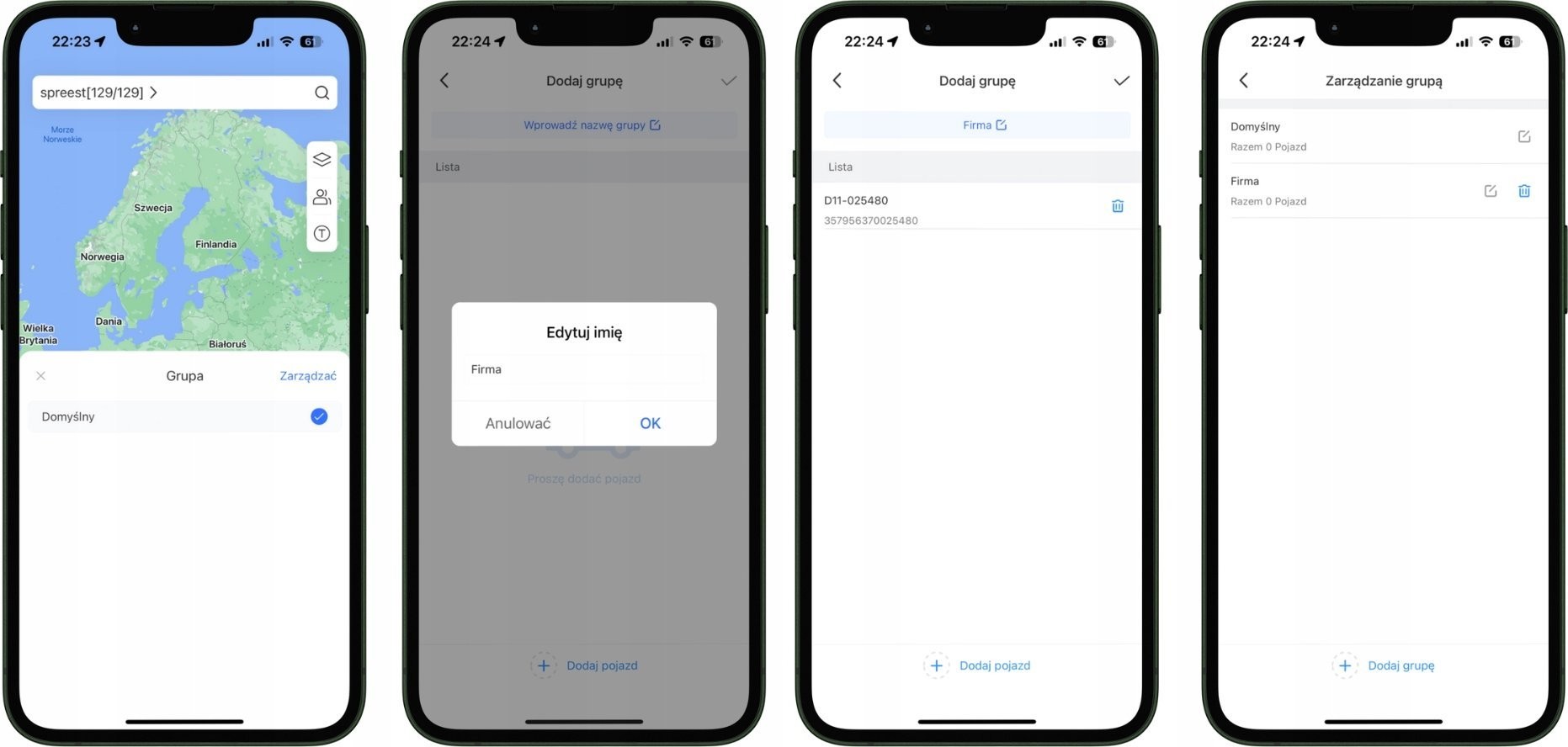 Proces tworzenia grup jest prosty i intuicyjny. Na pierwszym ekranie widzisz listę obecnych grup. Aby dodać nową grupę, przejdź do opcji "Dodaj grupę" i wprowadź nazwę grupy, na przykład "Firma" czy "Rodzina". Następnie możesz przypisać lokalizatory do tej grupy, co pozwala na łatwe zarządzanie i monitorowanie wszystkich pojazdów przypisanych do danej grupy.