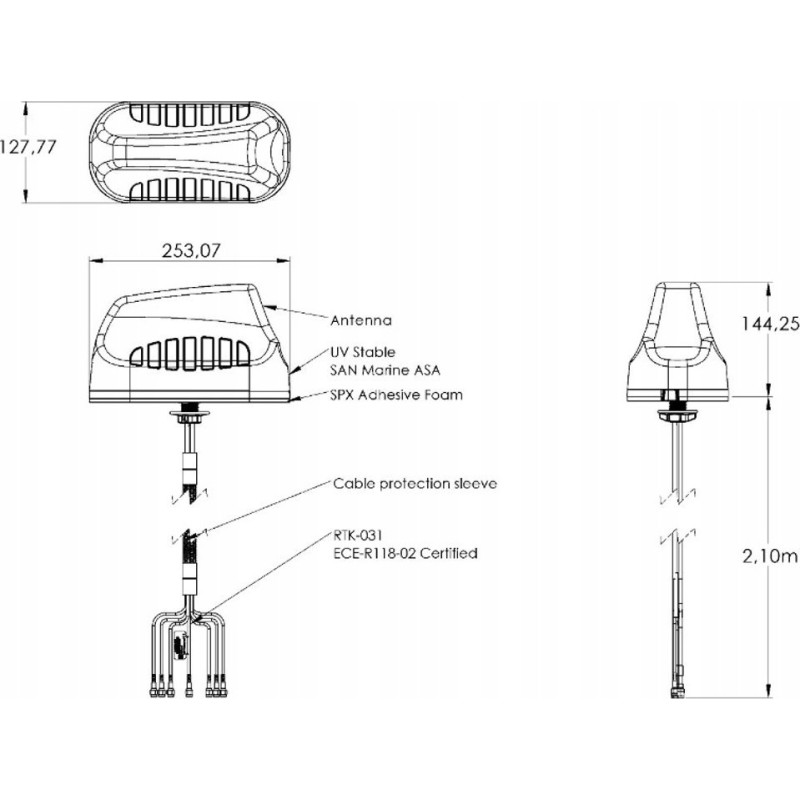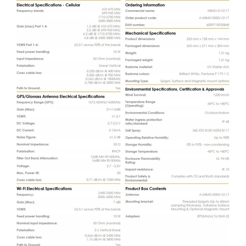 Antena Poynting MIMO-3-17B to ultraszerokopasmowe urządzenie, które obsługuje różnorodne technologie, w tym 2G, 3G, 4G oraz nowoczesne LTE i 5G. Wyposażona w cztery anteny komórkowe MIMO, dwie anteny Wi-Fi oraz antenę GPS/GLONASS, stanowi wszechstronny produkt, idealny do zastosowań w różnych środowiskach.