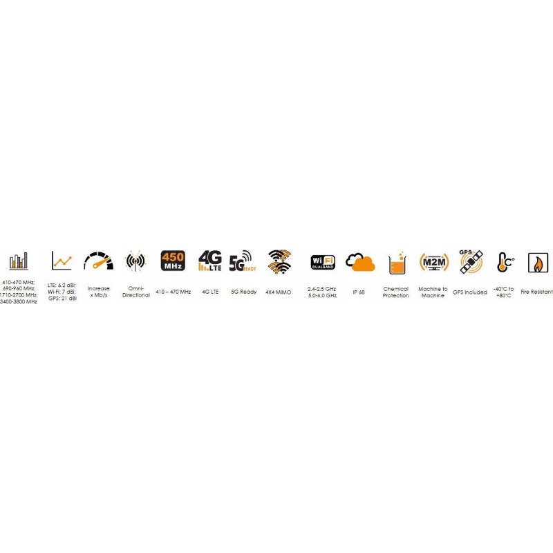 Antena wyróżnia się solidną konstrukcją odporną na niekorzystne warunki atmosferyczne, co potwierdza klasa ochrony IP68. Dzięki temu, urządzenie może działać w trudnych warunkach, co czyni je niezawodnym wyborem dla użytkowników oczekujących trwałości oraz odporności na czynniki zewnętrzne.