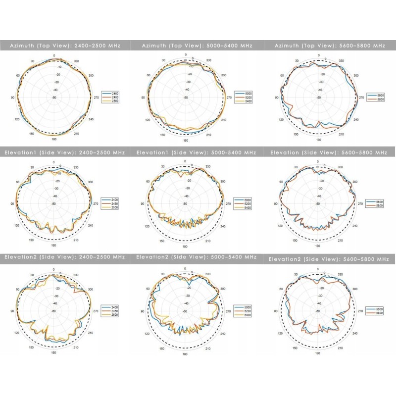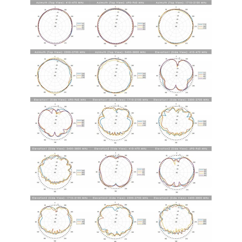 - Wzmocnienie w dBi: 410-470 MHz: 1 dBi, 690-960 MHz: 3,5 dBi, 1710-2700 MHz: 5,8 dBi, 3400-3800 MHz: 4 dBi, 2400-2500 MHz: 5 dBi, 5000-6000 MHz: 7 dBi