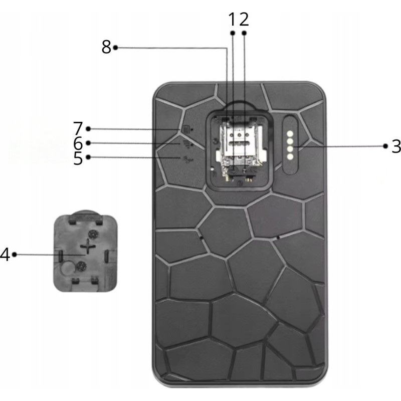 - Gniazdo na kartę SIM – Miejsce na kartę nano SIM wymaganą do działania lokalizatora i przesyłania danych GPS.
