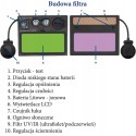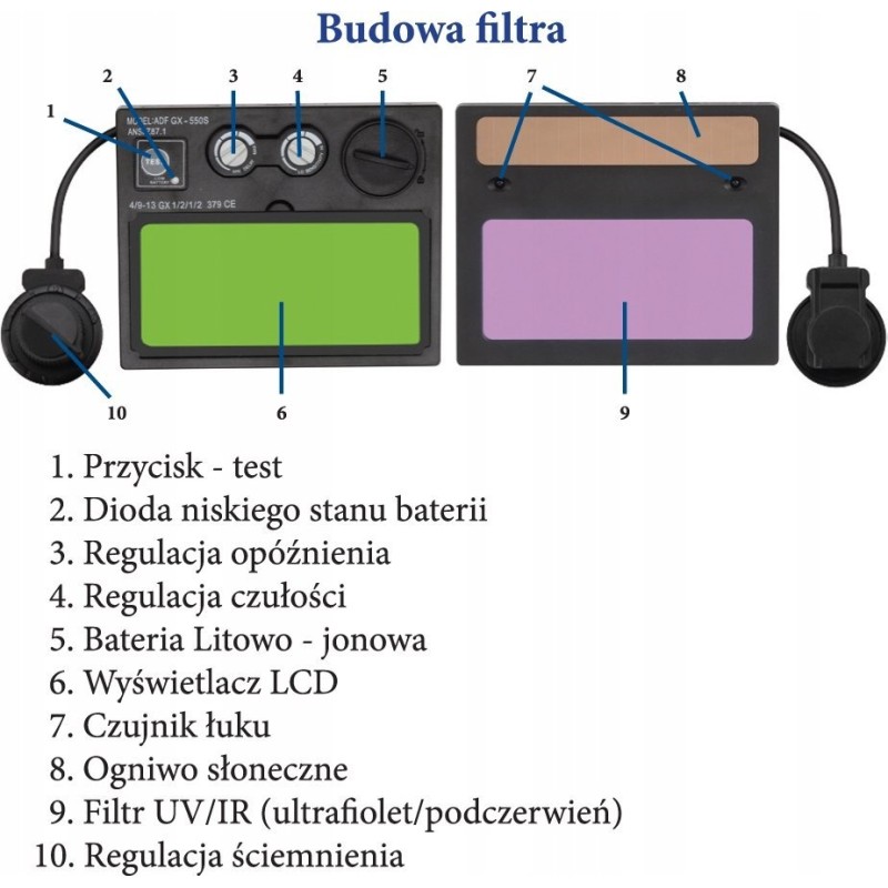 - Maskę można używać w temperaturze od -5°C do 55°C. Po wygaśnięciu łuku, filtr rozjaśnia się od całkowitego przyciemnienia do 4 DIN w czasie krótszym niż 1 sekunda. Maska posiada regulację wewnętrzną i zewnętrzną: przyciemnienia (w zakresie 9-13 DIN), czułości filtra oraz opóźnienia przyciemniania. Istnieje również możliwość wyboru trybu szlifowania lub spawania. W trybie "szlifowanie" filtr pozostaje jasny, a regulacja nie jest możliwa.