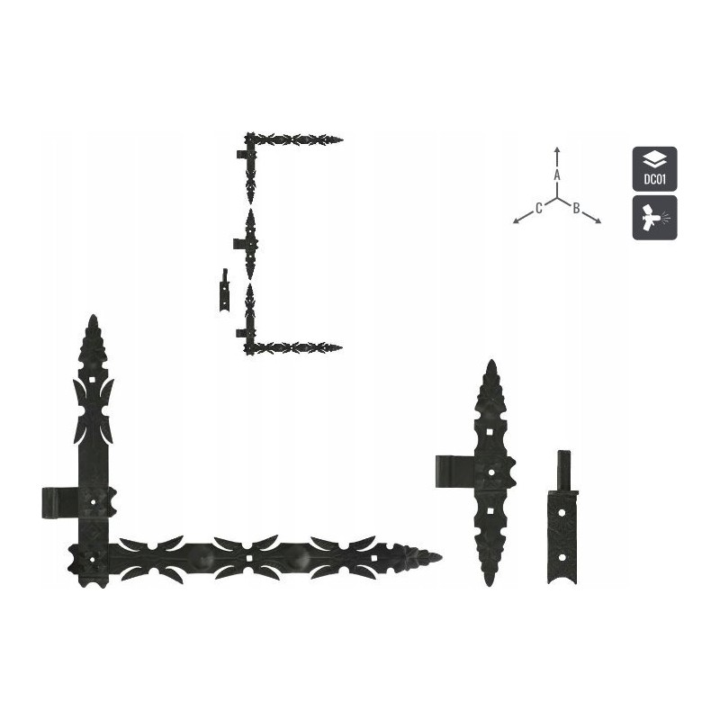 Tradycyjne zawiasy do ciężkich drzwi i bram. Okucia wykonane metodami kowalskiego rzemiosła pełnią funkcję dekoracyjną. Coraz częściej zyskują uznanie zwolenników rustykalnego stylu wyposażania domu.