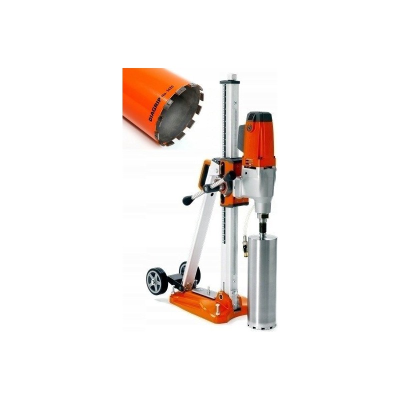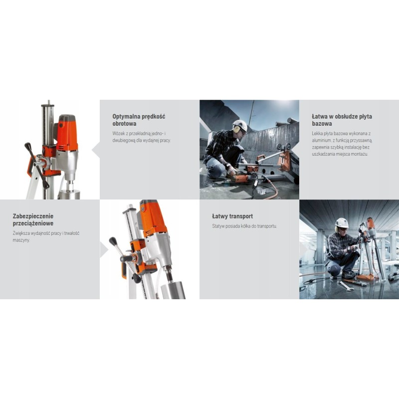 DMS 240 marki Husqvarna to elektryczny silnik ze statywem, nadający się do szerokiego zakresu zastosowań. Jest najmocniejszym spośród systemów do wiercenia ze statywem. Nadaje się idealnie do wiercenia w ścianach, posadzkach i sufitach wiertłami koronowymi o średnicy do 250 mm. Statyw można łatwo odchylać, podpora tylna umożliwia niezawodne, stabilne wiercenie pod kątem, dzięki czemu użytkownik oszczędza własne siły i czas wymagany do ustawienia maszyny. System przeznaczony do wiercenia przepustów rur, kabli, kanałów wentylacyjnych i kanalizacyjnych, otworów pod barierki i znaki drogowe. Wiertło koronowe nie znajduje się w zestawie.