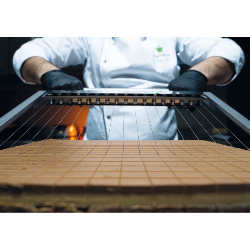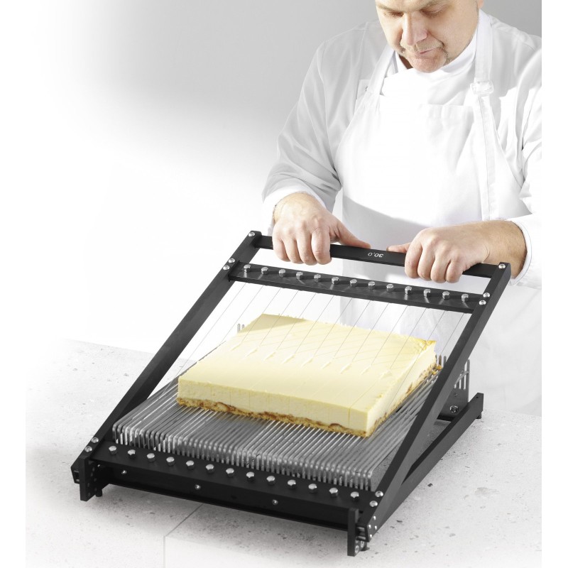 Gitara cukiernicza marki HENDI najlepiej sprawdzi się w usprawnieniu produkcji w cukierniach, piekarniach i punktach gastronomicznych. Urządzenie służy do precyzyjnego cięcia masy, ciast, musów na wiele równych kawałków bez zniekształceń i nadszarpnięć za pomocą zamontowanych strun wykonanych z higienicznej stali chirurgicznej w trzech wariantach (22,5 mm / 30 mm / 45 mm). Rama podstawy i ramki strun wykonane zostały z aluminium anodowanego w kolorze czarnym, a blat roboczy i płyta wytworzone są ze stali nierdzewnej, gwarantując wytrzymałość i łatwość w utrzymaniu czystości. W tym modelu zastosowano specjalistycznie zaprojektowane zawiasy wykonane z mosiądzu, które cechują się długą żywotnością produktu w odróżnieniu od innych produktów dostępnych na rynku. Dodatkowo antypoślizgowe nóżki i wyprofilowany blat (600 x 400 mm) gwarantują precyzje pracy.