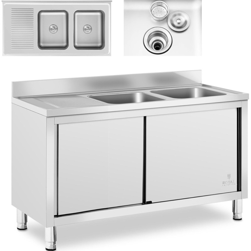 Royal Catering Zlew basen gastronomiczny dwukomorowy z szafką z drzwiami przesuwnymi 140 x 70 x 95 cm Zlew basen gastronomiczny