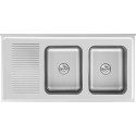 Zlew dwukomorowy posiada wymiary 500 x 400 x 300 mm. Umieszczony został po prawej stronie szafki. Doskonale nadaje się do mycia głębokich garnków czy blach do pieczenia. Wysokie ścianki chronią otoczenie przed zachlapaniem. W odpływie umieszczone zostało sitko, zapobiegające zatkaniu rur resztkami. Gładka powierzchnia gwarantuje łatwe utrzymanie zlewu w czystości. Zaokrąglone krawędzie zapewniają bezpieczeństwo użytkowania. Wysoki rant 100 mm chroni ścianę przez zabrudzeniem. Pod zlewem umieszczono dużą szafkę z przesuwnymi drzwiami do przechowywania naczyń, garnków czy patelni.
