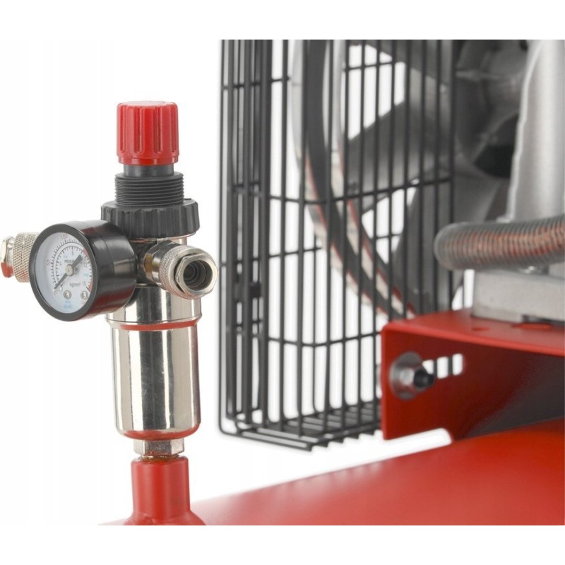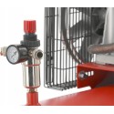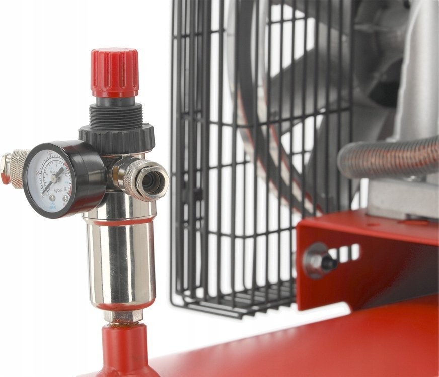 Kompresor olejowy z dwoma przyłączami i regulacją ciśnienia. Ma zastosowanie do napędzania urządzeń sprężonym powietrzem, przedmuchiwania nawiertów i czyszczenia powierzchni. Jest nieocenionym wsparciem w przemyśle, na budowie, w warsztacie i rolnictwie.