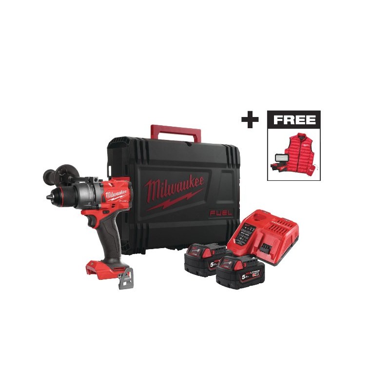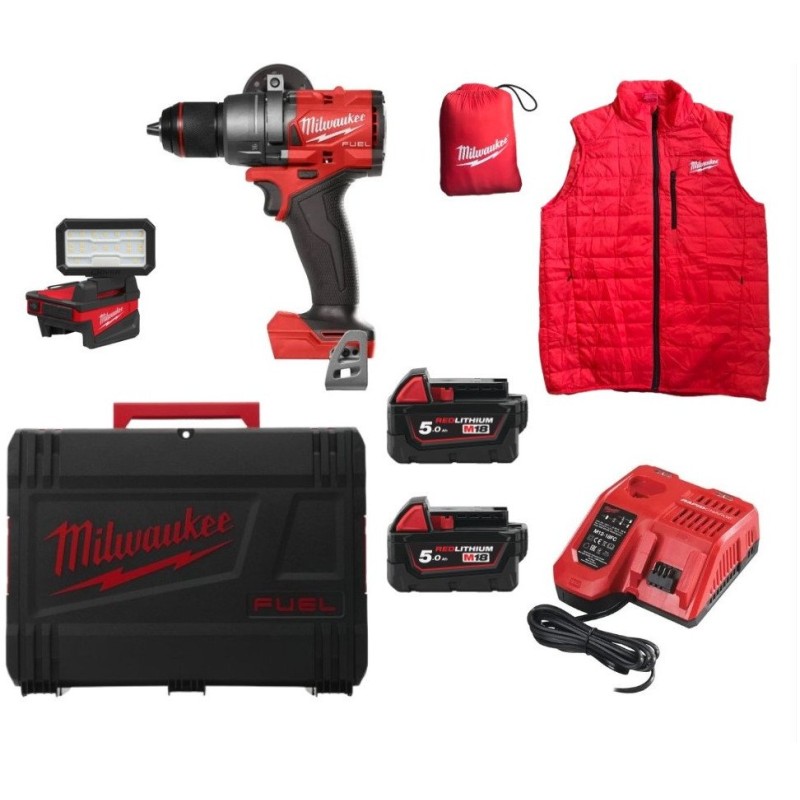 - Zawartość zestawu: 1 x wiertarka, 2 x baterie 5.0Ah, 1 x ładowarka, 1 x uchwyt pomocniczy, 1 x walizka transportowa