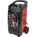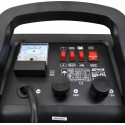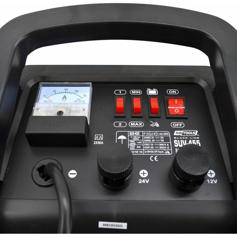 Niezawodna konstrukcja, odporna na trudne warunki pracy. Przeznaczony do ładowania akumulatorów ołowiowo-kwasowych. Obsługuje akumulatory o napięciu 12 i 24 V. Wyposażony w funkcję pomocniczego rozruchu silnika (samochody osobowe, dostawcze, ciężarowe, ciągniki). Ergonomiczna rączka i kółka ułatwiają transport. Przyjazny panel sterowania zapewnia łatwą obsługę. Dane techniczne: napięcie zasilania: 230 V / 50Hz napięcie ładowania: 12 / 24 V moc ładowania (maksymalnie): 1,2 kW prąd ładowania: 70 A prąd ładowania 12 V: 40 A prąd ładowania 24 V: 50 A moc rozruchu (maksymalnie): 8,5 kW prąd rozruchu: 400 A prąd rozruchu nominalny: 300 A pojemność akumulatora: 20 - 1000 Ah ilość poziomów ładowania: 4 waga: 18 kg wymiary 44 x 33 x 62 [szer. x gł. x wys. / cm] długość kabli wraz z zaciskami: 200 [cm] długość kabla zasilającego: 180 [cm] Wyposażenie: 1x prostownik 1 x amperomierz 1x zintegrowany kabel zasilający 1x zestaw kabli z zaciskami