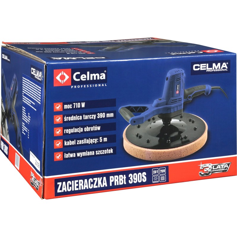 Zacieraczka CELMA Professional PRBt 390S przeznaczona jest do zacierania oraz wygładzania tynków wapienno-cementowych, gipsowych zewnętrznych i wewnętrznych, usuwania nierówności powierzchni “starych” tynków, zdzierania tapet, usuwania wypływek zaprawy spomiędzy cegieł lub przyschniętego tynku z betonowej podłogi. Urządzenie zostało zaprojektowane do długotrwałej pracy na dużych powierzchniach takie jak ściany, sufity oraz podłogi. Zapewnia wysoki komfort pracy oraz wyjątkową mobilność dzięki niskiej wadze, dobremu wyważeniu konstrukcji, odpowiednio rozmieszczonym gumowanym uchwytom oraz długiemu, 5-metrowemu przewodowi zasilającemu. Płynna regulacja obrotów w szerokim zakresie pozwala na właściwe dobranie prędkości obrotowej do wykonywanej pracy.