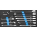 Wkład do szafek narzędziowych zawierający klucze płasko-oczkowe z grzechotką, które służą do odkręcania i przykręcania połączeń gwintowanych zakończonych elementem mocującym sześciokątnym, dwunastokątnym lub sześciokątnym typu TORX. Dzięki grzechotce nie zachodzi potrzeba przekładania klucza.