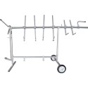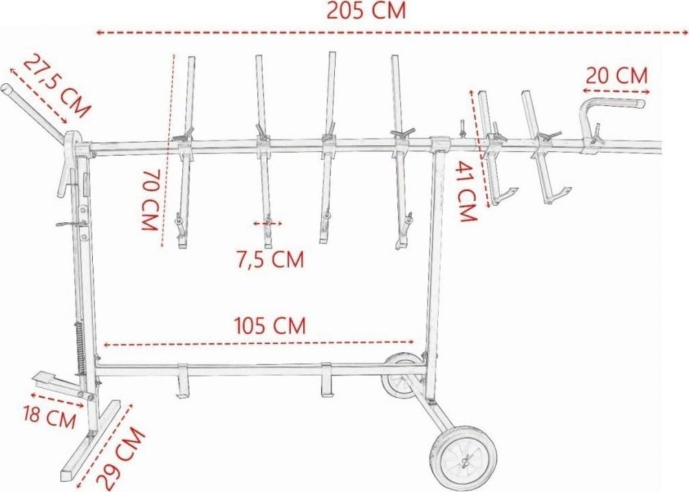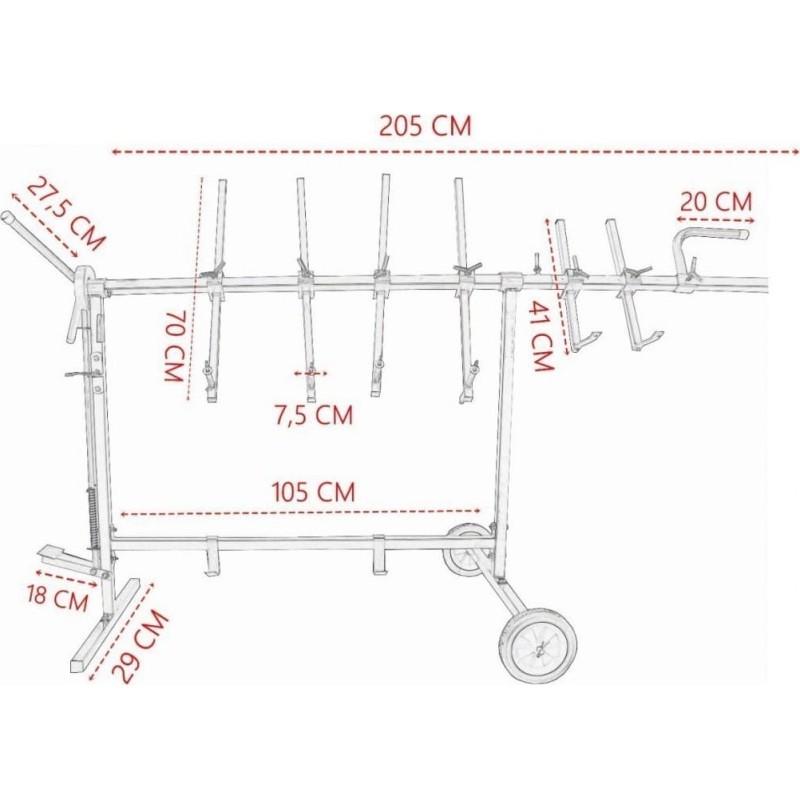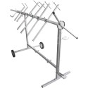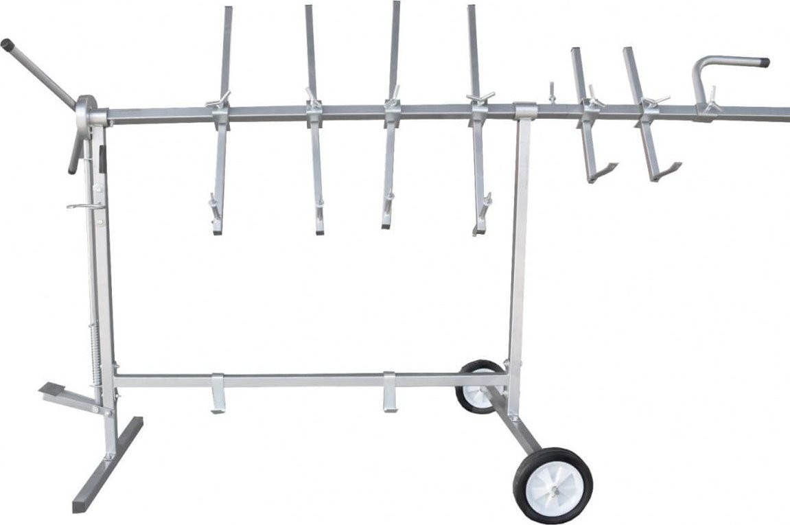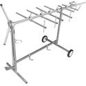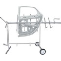 Stojak jest mobilny i z łatwością można go przestawiać co znacznie ułatwia pracę w warsztacie. Posiada 2 koła pokryte gumą odporną na środki używane w zakładach lakierniczych. System obrotowy blokowanym pedałem umożliwia obracanie elementów o 360° i ustawienie ich w różnych pozycjach. Zęby na kole blokującym są doskonale dopasowane dzięki czemu elementy zawieszone na stojaku są bardzo stabilne i nie chwieją się. Cały stelaż został wykonany z wysokiej jakości stali co zapewnia długą żywotność produktu.