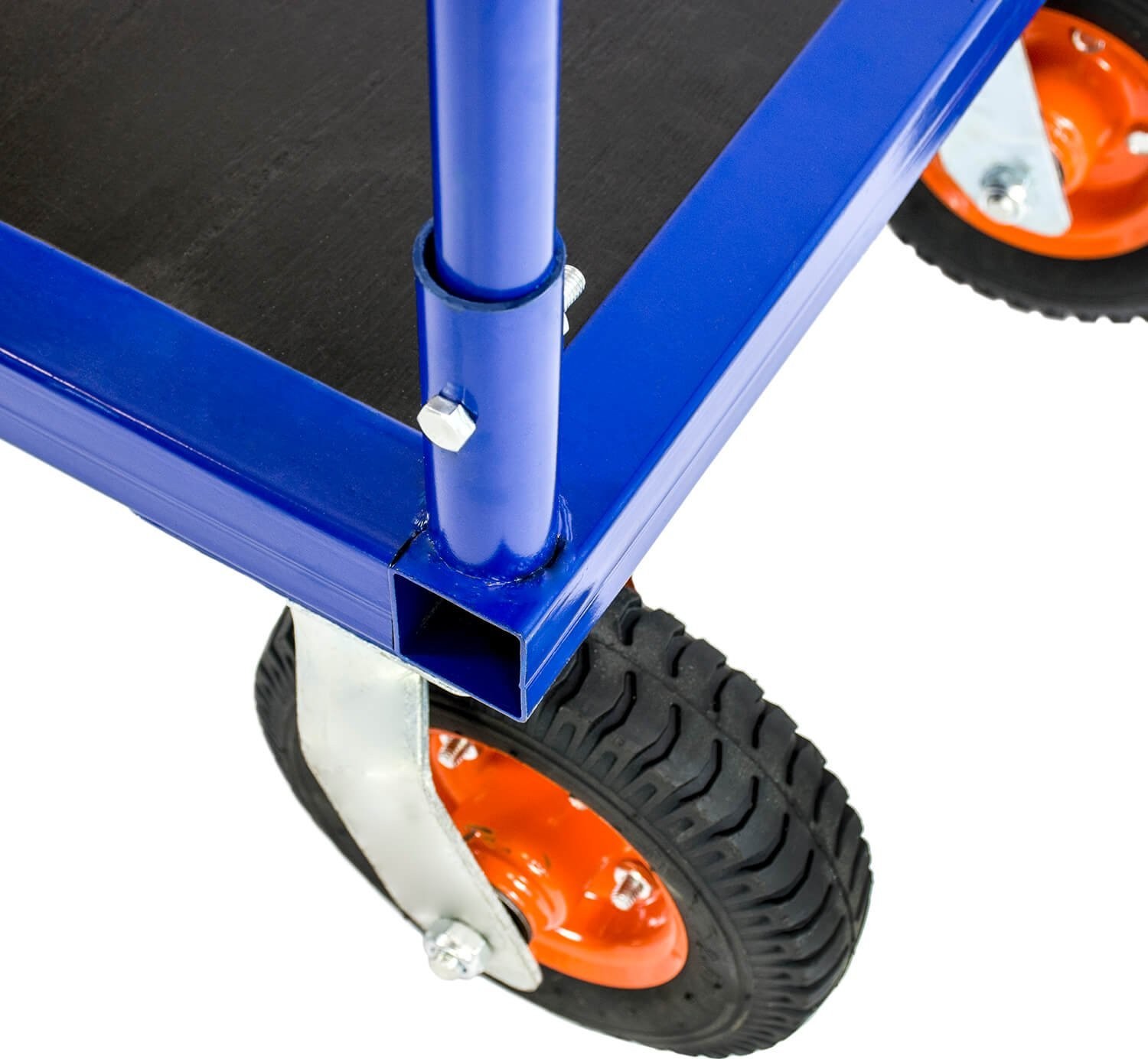 - wzmocniona rama zwiększa wytrzymałość wózka i zapewnia sztywność konstrukcji - grube stalowe profile!