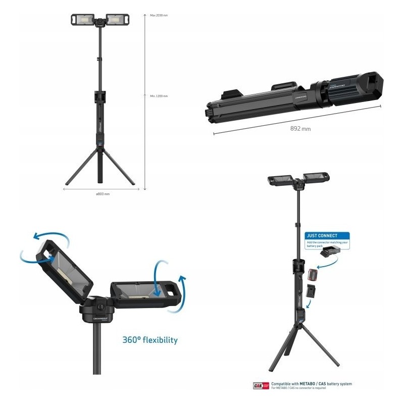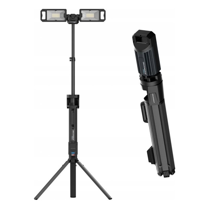 Obracane o 360° reflektory można ustawić w różnych pozycjach, aby uzyskać pożądany kąt oświetlenia, zapewniając idealne warunki do prac malarskich i instalacyjnych. Wysokość uzyskana po rozciągnięciu statywu – do 2,3 m. Ma 2 poziomy mocy światła (50-100%), co umożliwia dostosowanie światła do zadania roboczego.