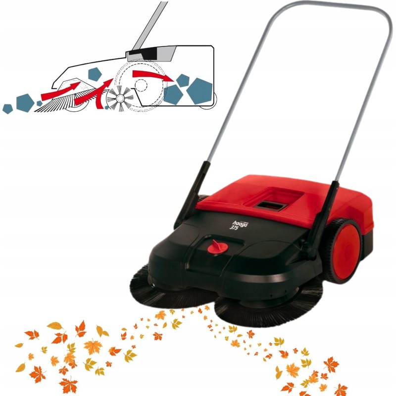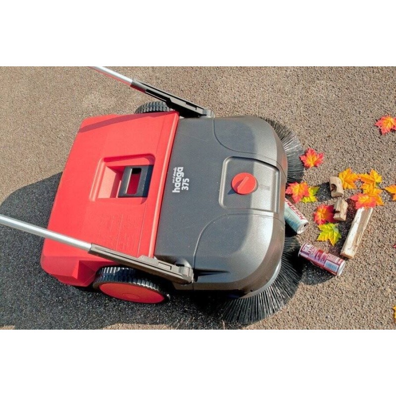 Zamiataczka HAAGA 375 wyposażona w system Turbo, lepszy efekt zamiatania dzięki zastosowaniu dwóch zamiataczy przednich oraz dodatkowo walca zamiatającego obracającego się w kierunku przeciwnym do kierunku jazdy.