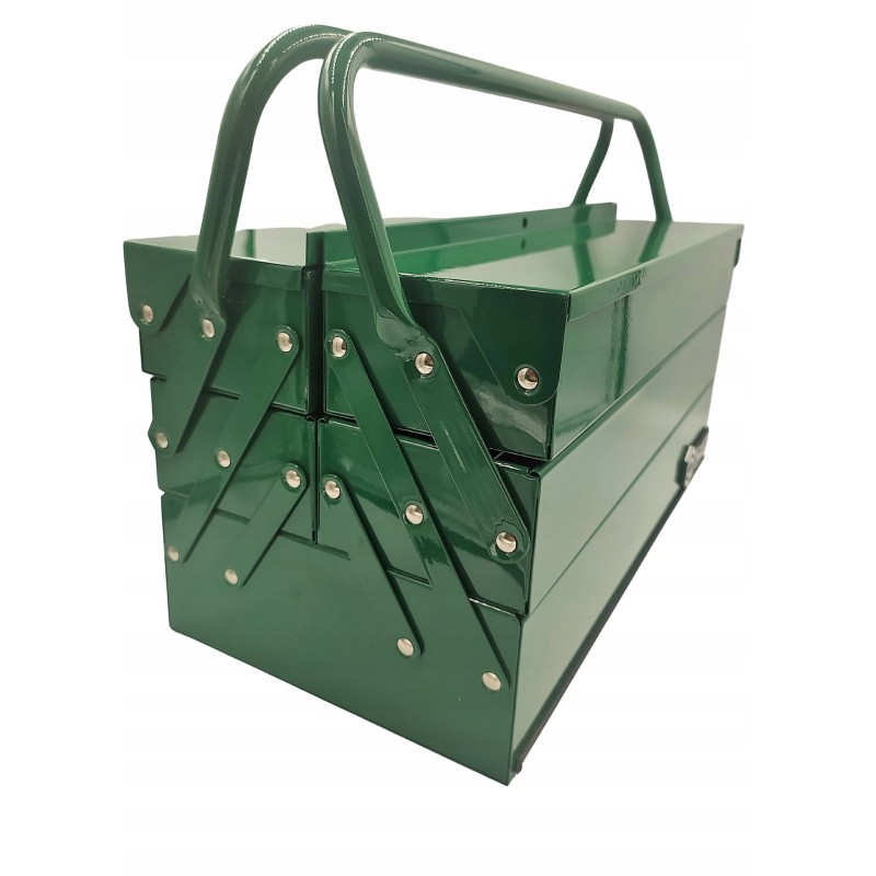 Skrzynka narzędziowa została wykonana z grubej blachy stalowej, malowanej proszkowo, co zapewnia jej odporność na uszkodzenia. Dzięki solidnej konstrukcji, narzędzia są zawsze bezpieczne i łatwo dostępne, co zwiększa komfort pracy.