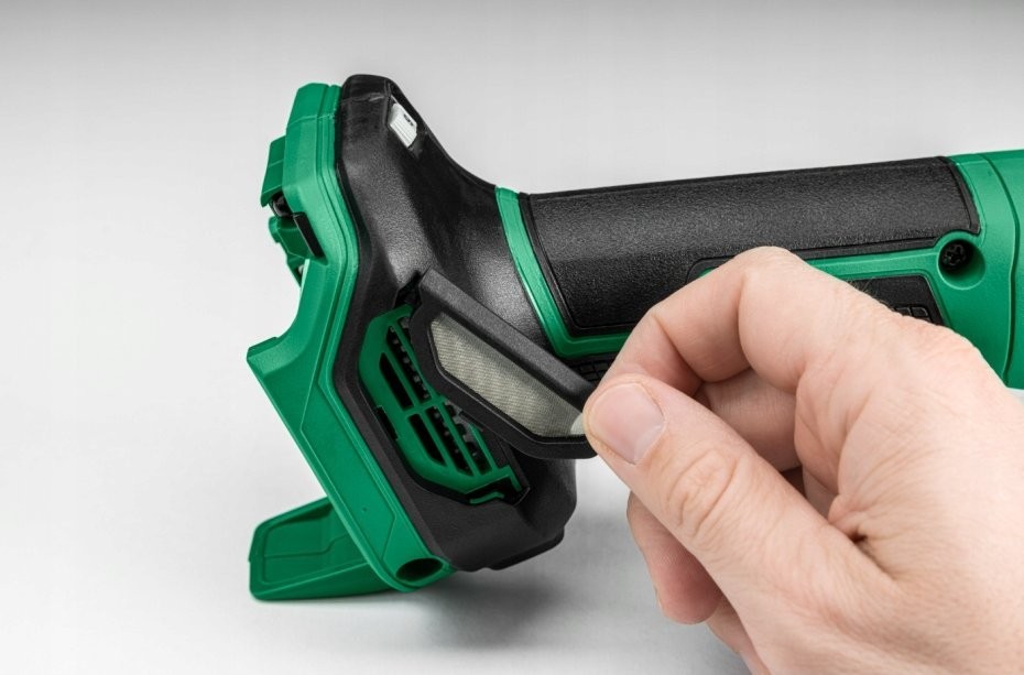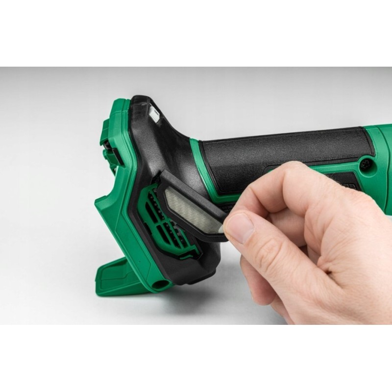 Szlifierka ma bezszczotkowy silnik i używa pojemnych akumulatorów Li-ion, co oznacza, że urządzenie ma świetną wydajność pracy na jednym ładowaniu.