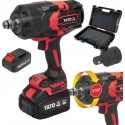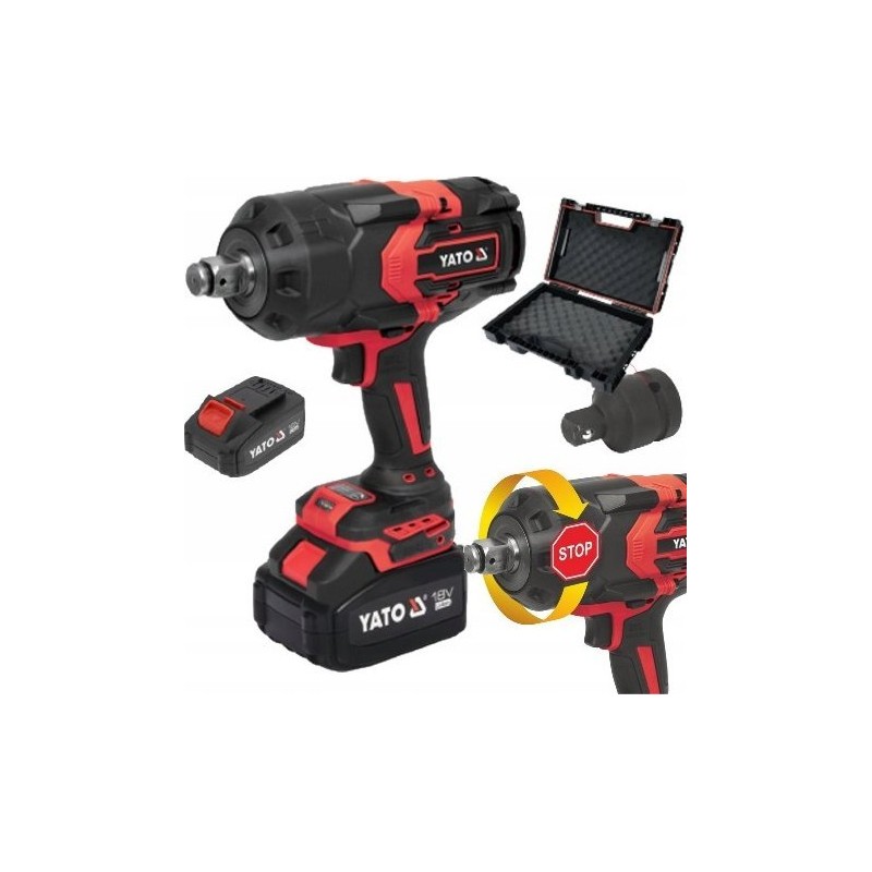 Najmocniejszy w ofercie YATO akumulatorowy klucz udarowy. Jego bezszczotkowy silnik dostarcza moc 2400 Nm pozwalającą na wymianę kół w samochodach ciężarowych, busach, pracę przy maszynach budowlanych i rolniczych. Klucz sprawdzi się przy montażu konstrukcji, hal stalowych, barier energochłonnych oraz słupów oświetleniowych. Hamulec wrzeciona zabezpiecza użytkownika w przypadku zablokowania pracy klucza. Użytkownicy docenią trwałość konstrukcji, dobrze spasowane elementy i ergonomię pracy. W zestawie z narzędziem adapter 3/4 na 1/2 cala.