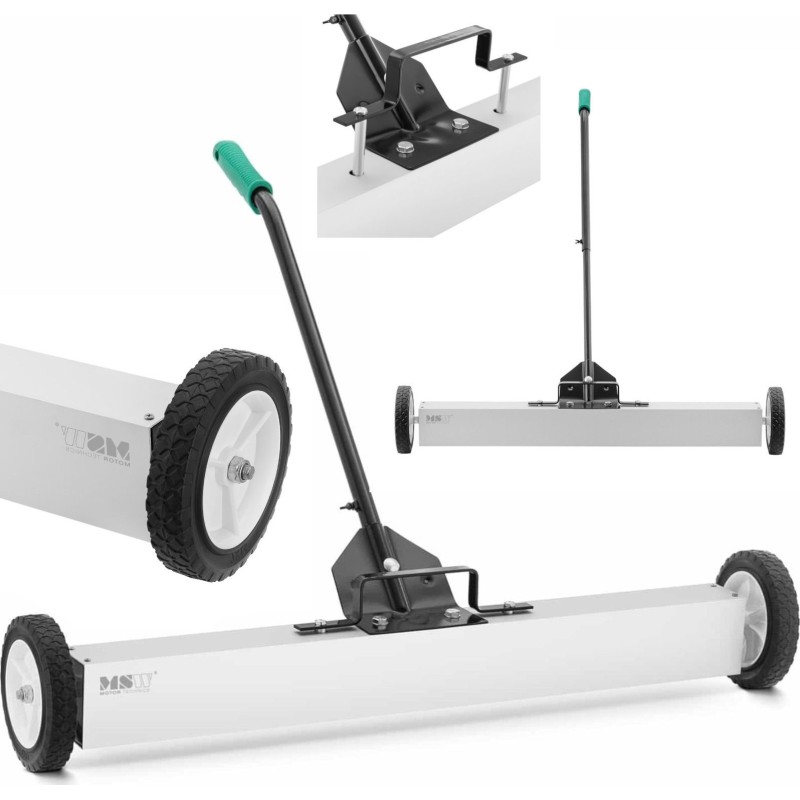 Miotła magnetyczna marki MSW posiada silny magnes ferrytowy. Z powodzeniem zbiera śruby, wióry, gwoździe, igły i inne drobne części metalowe. Pozwala wyczyścić chodniki, rampy, powierzchnie sklepowe, boiska sportowe, warsztaty, place budowy czy parkingi. Miotła posiada regulowany drążek w zakresie 73-100 cm. Szerokość miotły wynosi 90 cm. Czyszczenie magnesu przebiega szybko za sprawą uchwytu zwalniającego na urządzeniu. Duże koła zapewniają zwrotność urządzenia, sprawdzą się nawet na nieutwardzonych powierzchniach.