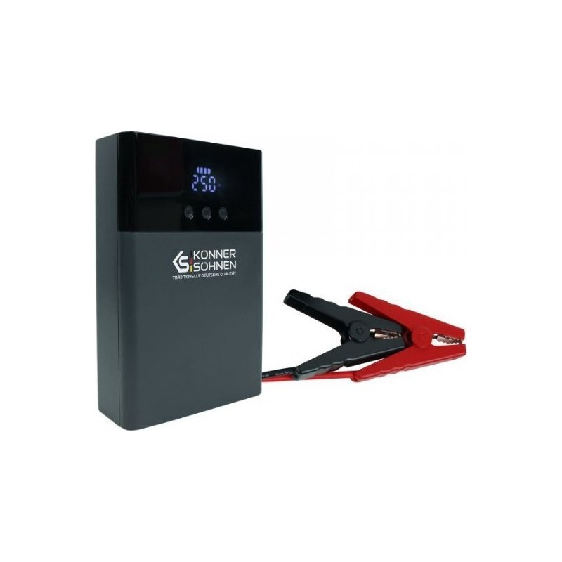 Dane techniczne: Typ wbudowanego akumulatoraLitowo-jonowy Bateria, mAh14000 Maks. ciśnienie pneumatyczne, psi150 Wyjście USB2 x 5 V/2 A Lampa LED+ Znamionowy prąd rozruchowy, A600 Szczytowy prąd rozruchowy, A1200 Czas ładowania urządzenia, godzin4-5 Temperatura pracy, °C-20°C ... +60°C Wymiary netto (DxSxW), mm200 x 130 x 52 Wymiary brutto (DxSxW), mm262 x 182 x 112 Waga brutto, kg1.45 Opis: Urządzenie rozruchowe z kompresorem KS JSP-1200 będzie niezastąpione w przypadkach, gdy akumulator samochodowy jest rozładowany, lub gdy jego poziom naładowania nie wystarczy do uruchomienia silnika, czy napompowania opon pojazdu, sprzętu sportowego. Wyposażony jest w najnowocześniejszy, wysokiej jakości akumulator litowo-jonowy 14000 mAh o wysokim prądzie powrotnym do 1200 A, który pozwala na uruchomienie pojazdów z silnikami benzynowymi do 8 litrów i silnikami diesla do 4 litrów w ciągu kilku sekund. Zaciski posiadają dodatkowe połączenie płytek mocujących za pomocą przewodu, co pozwala na zwiększenie powierzchni mocowania oraz zmniejszenie oporów podczas przenoszenia mocy. Posiada maksymalny stopień ochrony: przed przeciążeniem prądowym, przeładowaniem, nadmiernym rozładowaniem, przegrzaniem, odwrotną polaryzacją, przepięciem. Uniwersalny kompresor do pompowania opon, materacy, piłek itp. bez problemu napompuje do zadanej wartości. Gdy ciśnienie wzrośnie powyżej wartości ustawionej do pompowania, kompresor przestaje pompować, więc nie trzeba ciągle zatrzymywać się i mierzyć ciśnienia. Urządzenie KS JS-1200 jest wyposażone w dwa złącza wyjściowe USB o natężeniu prądu 2A, dzięki czemu można ładować wiele różnych urządzeń. Wygodna i kompaktowa ładowarka 4 w 1 KS JS-1200 zmieści się w schowku Twojego samochodu, zawiera torbę do przechowywania, kabel z zaciskami do akumulatora i kabel do ładowania urządzenia.Teraz będziesz potrzebował minimalnego wysiłku, aby uruchomić silnik swojego samochodu. ...