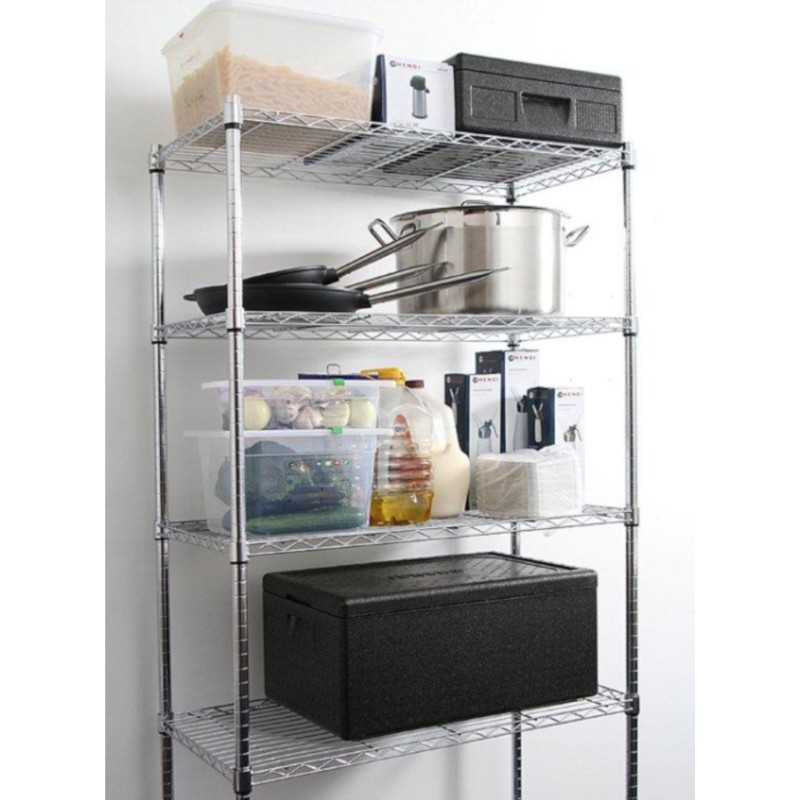 Regał magazynowy druciany marki Hendi dzięki dużej nośności pozwoli na przechowywanie dużej ilości produktów. Każda z pięciu półek posiada maksymalny udźwig 80kg przy równomiernym obciążeniu. Położenie półek można regulować. Całkowita wysokość regału wynosi 1830mm. Otwarta budowa mebla ułatwia układanie oraz dostęp do produktów z każdej strony. Regał do samodzielnego montażu.