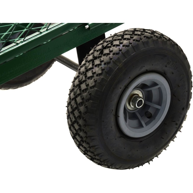 Czterokołowa ogrodowa przyczepka transportowa. Wyposażona w cztery pompowane koła oraz skrętną przednią oś. Przyczepka przeznaczona do przewożenia, ciężkich i nieporęcznych ładunków.