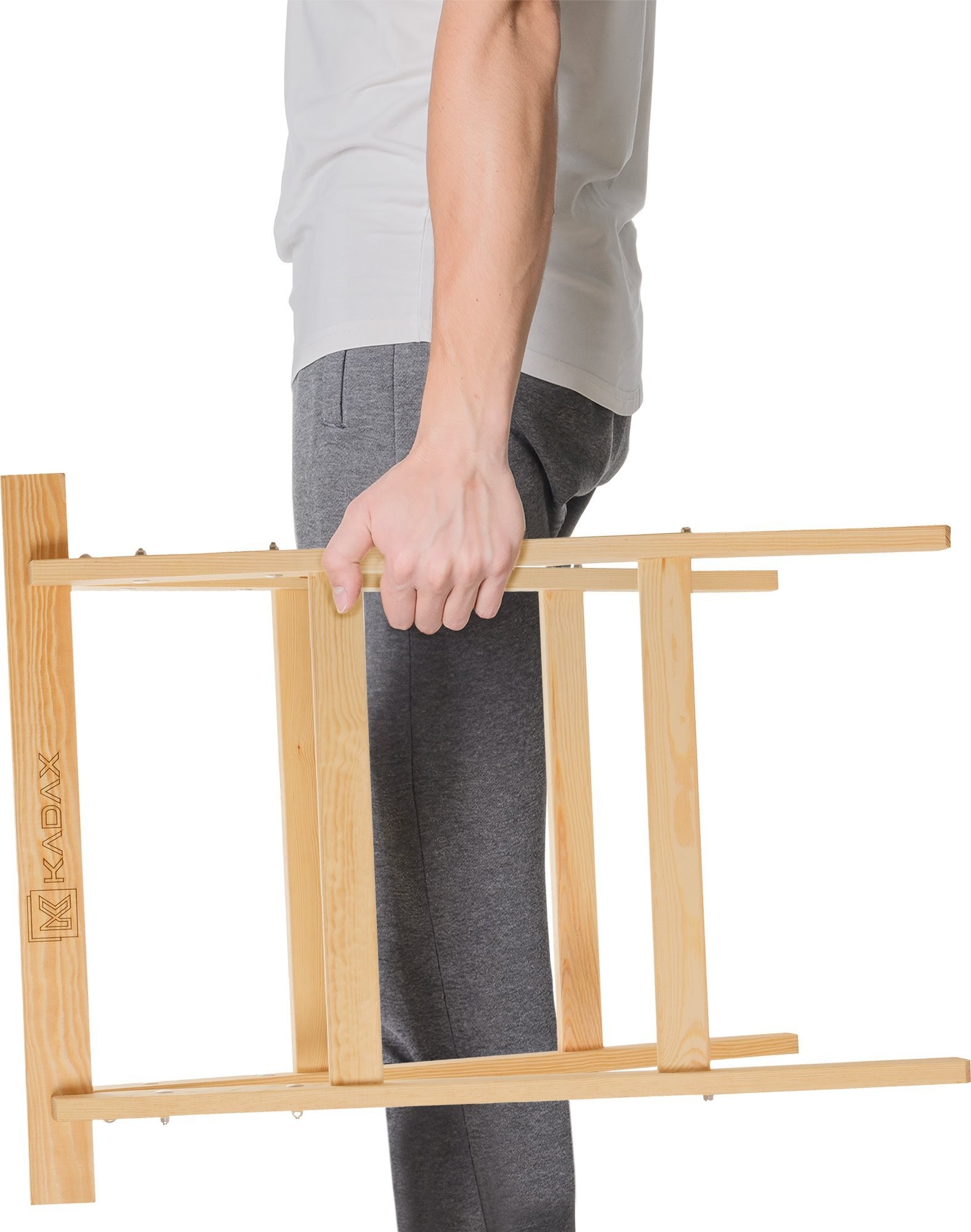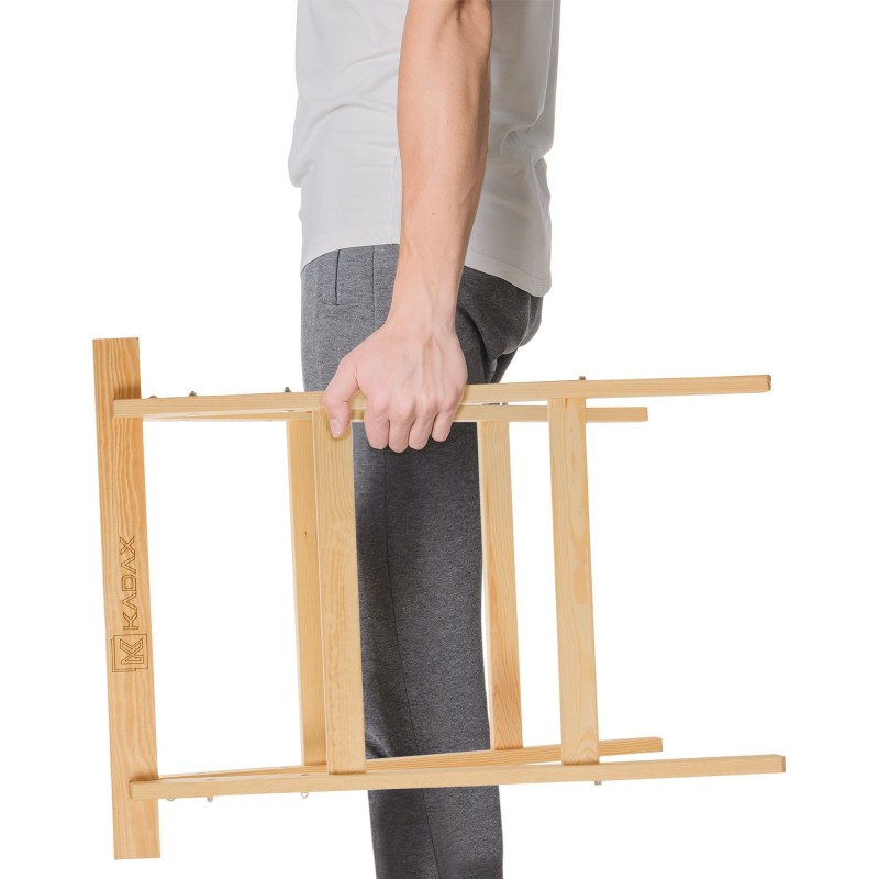 Kompaktowy – oferowane przez markę Kadax drewniane koziołki nie będą trudne w przechowywaniu. Całkowite wymiary stojaków wynoszą 70 x 80 centymetrów, przy wadze zaledwie 4 kilogramów.