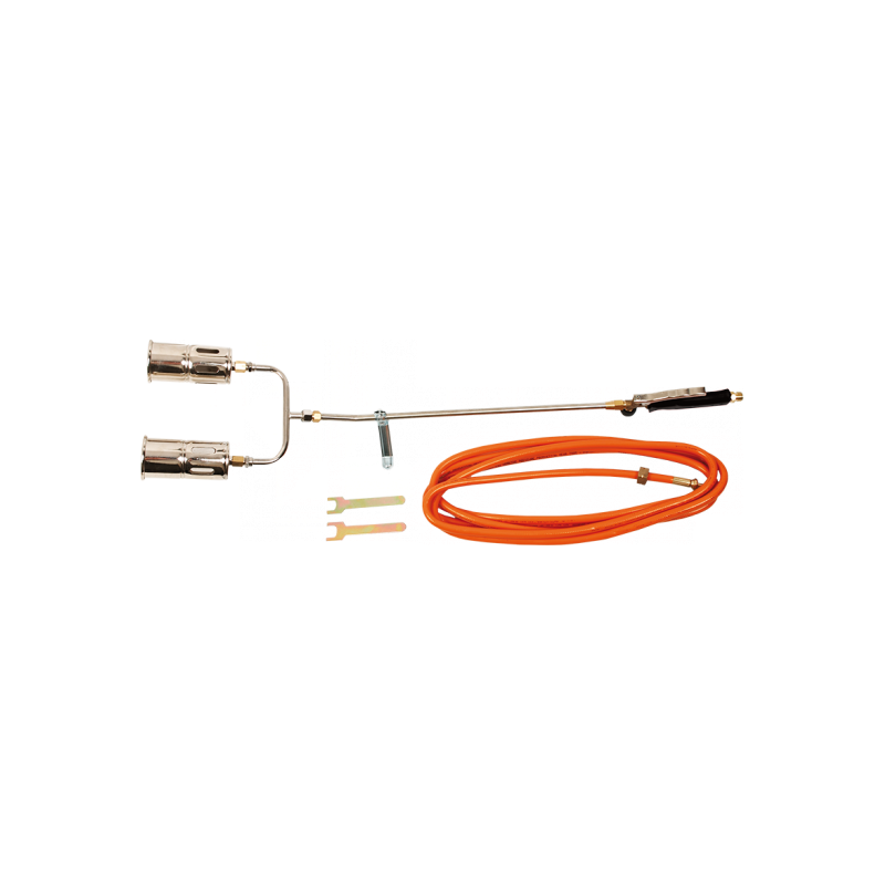 Zestaw dekarski 110kW, 2 palniki, wąż 5 m, dł. lancy 50 cm, temperatura pracy 1850°C, średnie zużycie gazu 7800 g/h, masa 1.5 kg