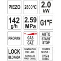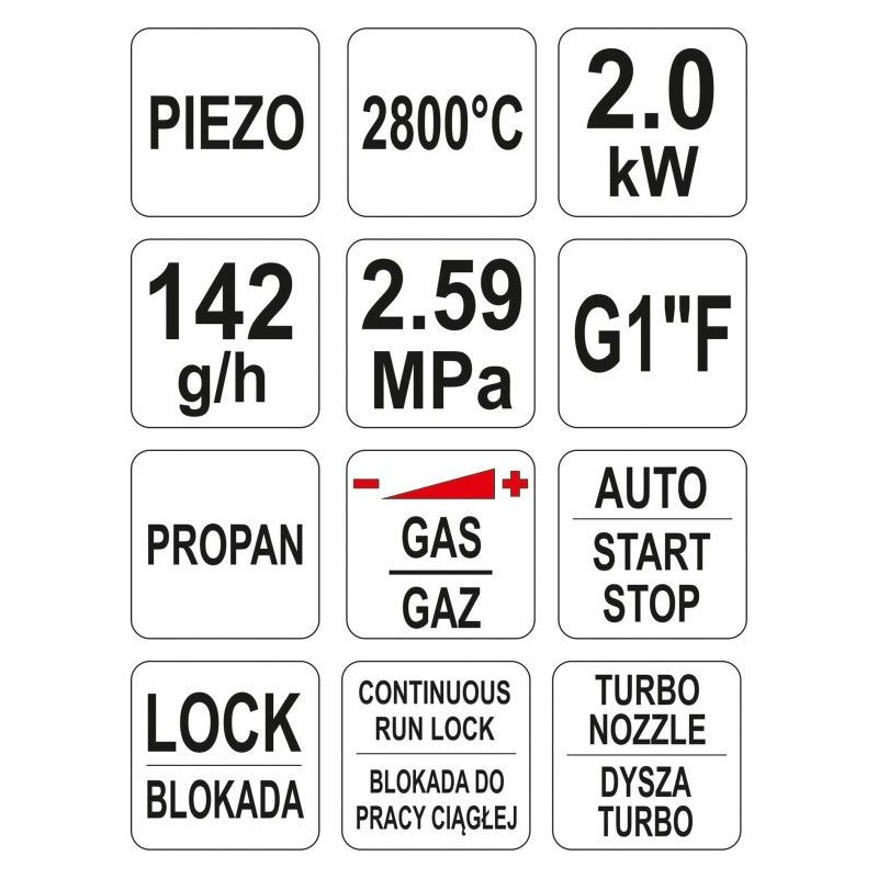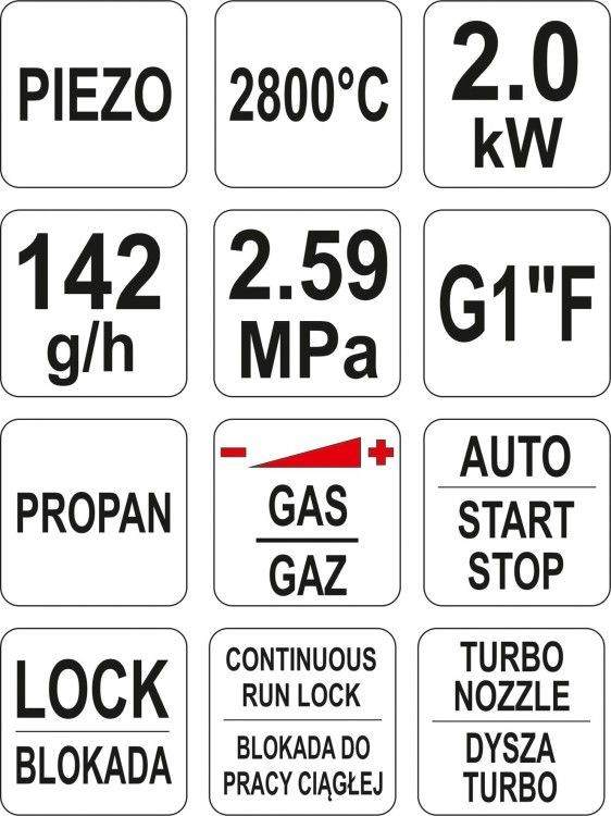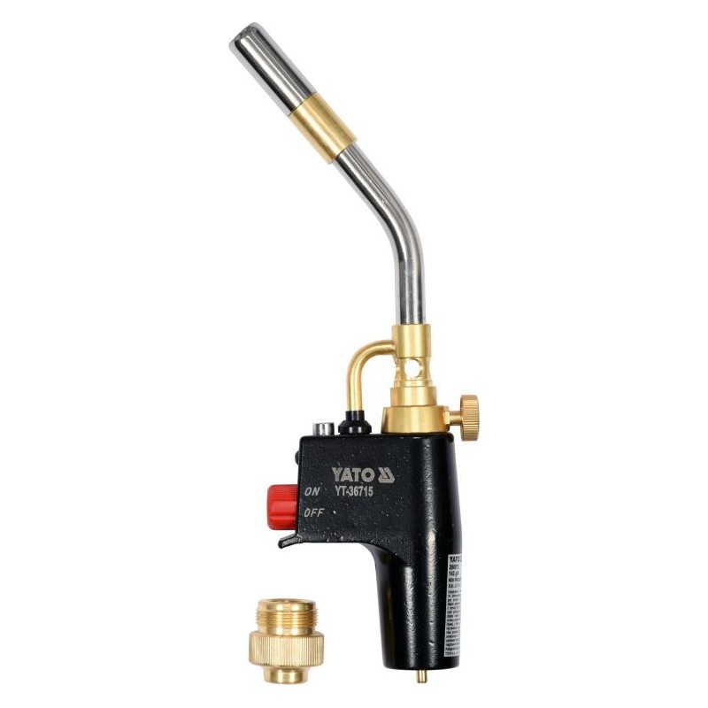 Dane techniczne Temperatura robocza [°C] 2800Zużycie gazu 142g/h Zapłon piezo Yes Gaz zasilający Propan Profesjonalny palnik gazowy turbo YT-36715. Palnik YATO przeznaczony do zastosowań profesjonalnych. Szczególnie polecany do prac hydraulicznych i instalatorskich możliwia: lutowanie twarde - rury miedziane o średnicy do 32mm lutowanie miękkie - rury miedziane o średnicy do 100mm spawanie. Dzięki zastosowaniu najwyższej jakości komponentów, takich jak mosiężny korpus, palnik pozwala osiągnąć temperaturę 28000C i moc 2,0kW. Zasilany jest gazem propan lub mieszanką MAPP, co umożliwia osiągnięcie bardzo wysokich parametrów pracy bez konieczności podłączania dodatkowych butli z gazem. Zużycie gazu wynosi 142g/h, a ciśnienie 2,59MPa. Palnik wyposażony jest w dyszę TURBO wytwarzającą płomień wirowy. Dzięki temu zwiększa się przepływ gazu, co powoduje znacznie większą wydajność i szybsze nagrzewanie rur. Palnik YATO posiada szereg bardzo przydatnych funkcji: zapłon PIEZO - ułatwia zapalenie gazu bez konieczności stosowania zewnętrznego zapalnika blokadę spustu - zabezpiecza przed przypadkowym włączeniem palnika blokada do pracy ciągłęj - szczególnie przydatny podczas dłuższej pracy. Umożliwia na zablokowanie palnika w pozycji włączonej bez konieczności przytrzymywania palcem przycisku regulacja gazu - pozwala dostosować moc płomienia w zależności od potrzeb Istotną zaletą palnika YATO jest funkcja AUTO START/STOP. Dzięki specjalnej konstrukcji i wbudowanemu zaworowi obsługa palnika jest bardzo wygodna i pozwala na obsługe go zaledwie jedną ręką. Palnik uruchamiany jest poprzez naciśnięcie jednego przycisku i działa tylko gdy jest on wciśnięty. Natomiast po zwolnieniu przycisku palnik się automatycznie wyłączy. Nie ma konieczności zakręcania dopływu gazu za każdym razem. Znacznie ułtwia to i przyspiesza pracę. Poza tym ogranicza zużycie gazu. Palnikiem YATO można pracować pod kątem 3600 co pozwala na bezpieczną pracę w każdej pozycji, nawet w najtrudniej dostępnych miejscach. Palnik posiada przyłącze do butli z gazem z gwintem G1"F. Dodatkowo w zestawie dołączony jest adapter umożliwiający podłączenie butli z przyłączem G7/16"F. Dzięki temu możliwe jest podłączenie do palnika YATO obu stosowanych na rynku rodzajów butli.