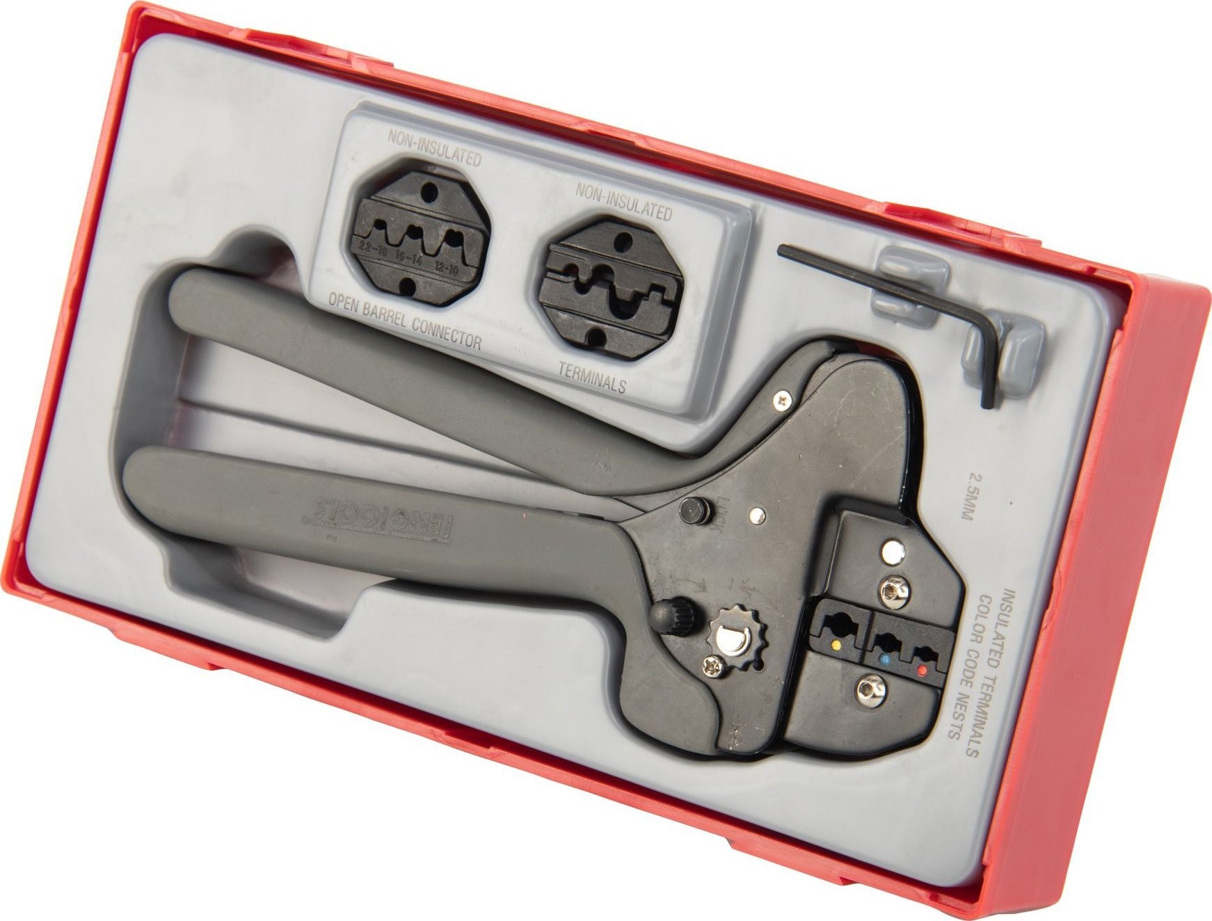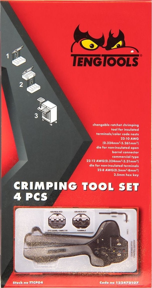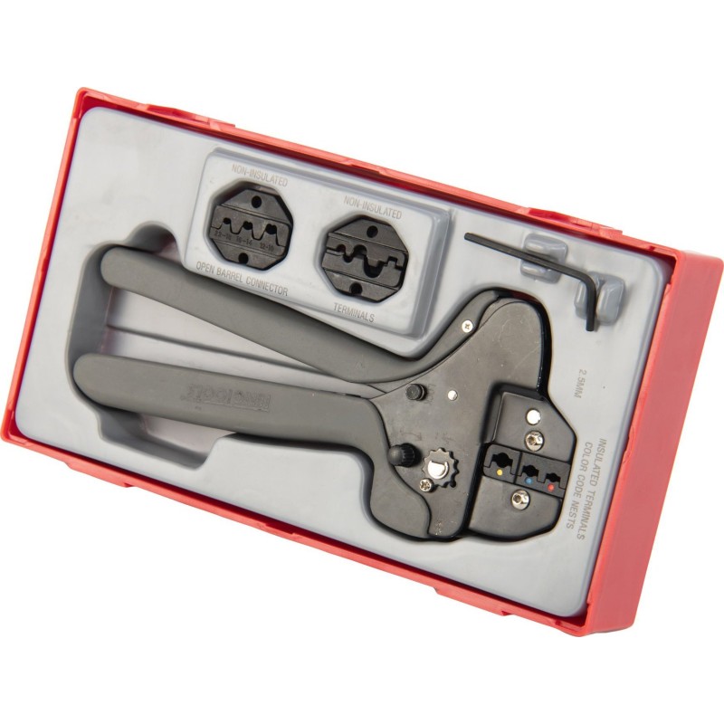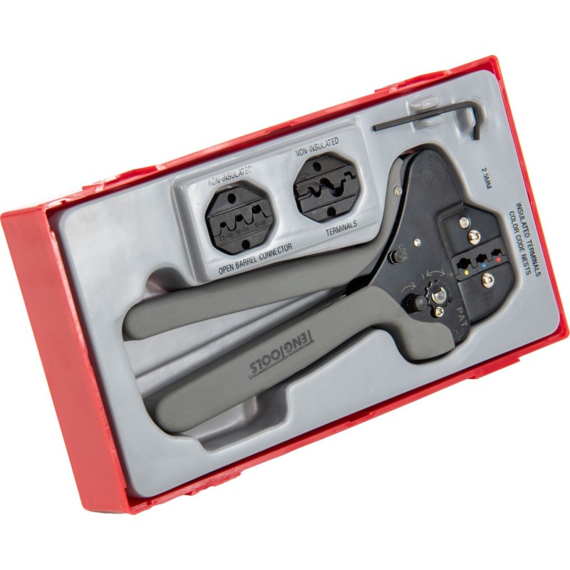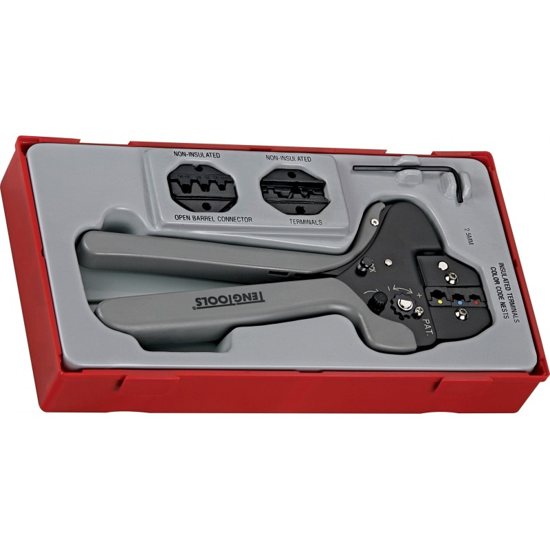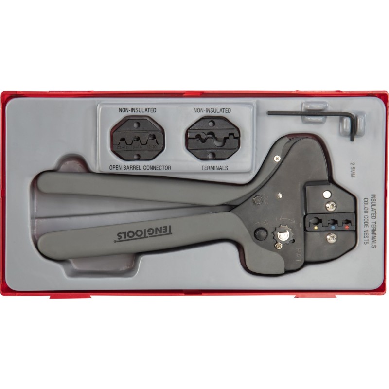 Zestaw zawiera narzędzie zaciskowe z trzema wymiennymi głowicami, do dołączania izolowanych i nieizolowanych końcówek do przewodów elektrycznych, oraz klucz trzpieniowy sześciokątny 2.5 mm. Dostarczany w pojemniku tworzywowym z odłączaną pokrywą. Pasuje do skrzynek i wózków narzędziowych Teng Tools.