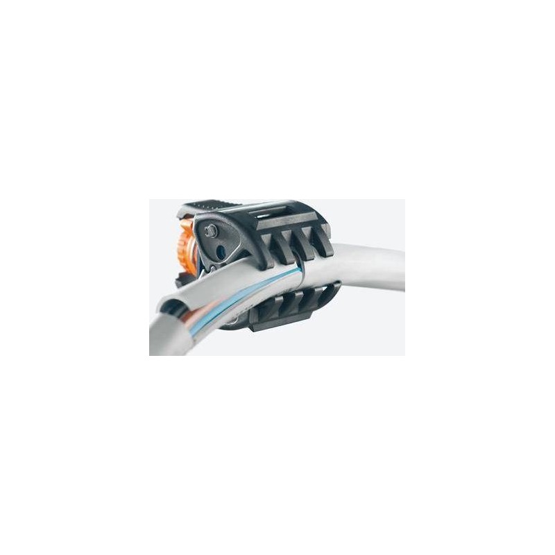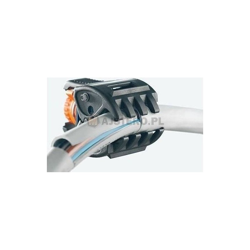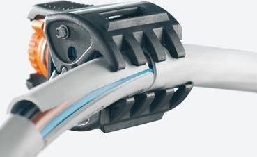 Narzędzie do usuwania płaszcza z kabliWykonanie: z tworzywa sztucznego wzmocnionego włóknem szklanym. Specjalny kształt noża pozwala na usuwanie specjalnych izolacji żył i ich konstrukcji. Wymienny moduł ściągający izolację. Zintegrowane ostrze do łamania naciętych izolacji. Regulowana głębokość cięcia od 0,8–2,5 mm. Zastosowanie: do ściągania izolacji z okrągłych kabli PCW w każdym dowolnym miejscu, szczególnie do prac w kanałach kablowych. Nadaje się do przecinania wzdłużnego i obwodowego....