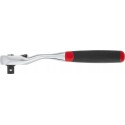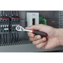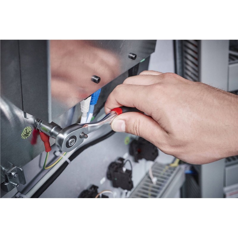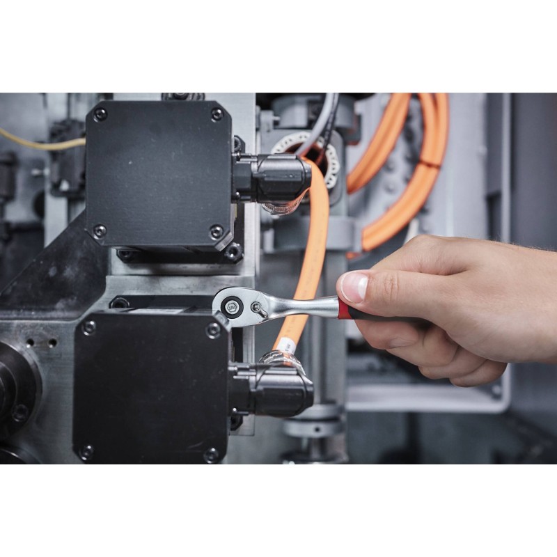 Wiha przełączalna grzechotka z przyciskiem i zabezpieczeniem kulkowym umożliwia łatwe otwieranie i zamykanie połączeń śrubowych. Wygodna praca przy użyciu dwustronnego uchwytu i precyzyjnie zazębionej grzechotki z 72 zębami i małym kątem ruchu powrotnego wynoszącym 5°. Wytrzymała i niezawodna konstrukcja wykonana z wysokiej jakości stali chromowo-wanadowej zapewnia bezpieczne i precyzyjne dokręcanie śrub. Przełączanie obrótów w prawo i w lewo jest proste dzięki dźwigni przełączającej.