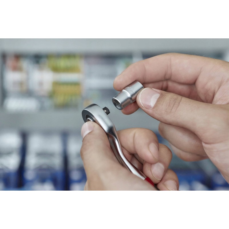 Grzechotka umożliwia również pracę w wąskich przestrzeniach, a jej wygięty kształt zapewnia lepszą kontrolę i ochronę przed urazami. Spełnia normy DIN 3122 / ISO 331.