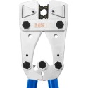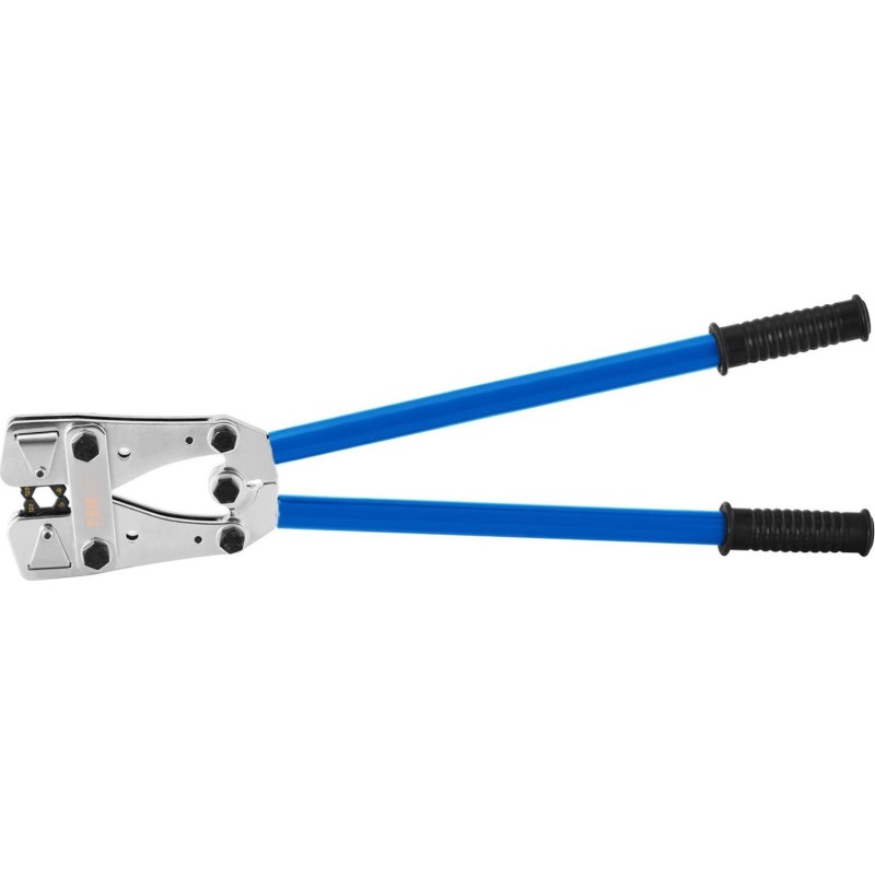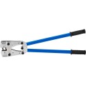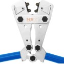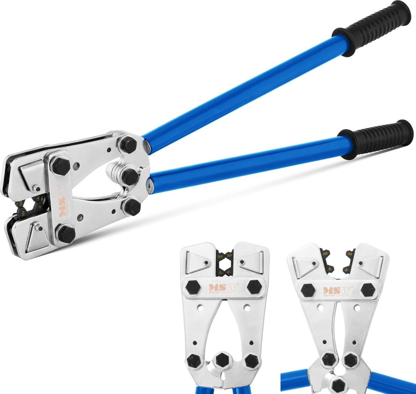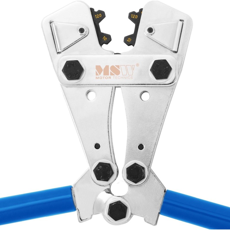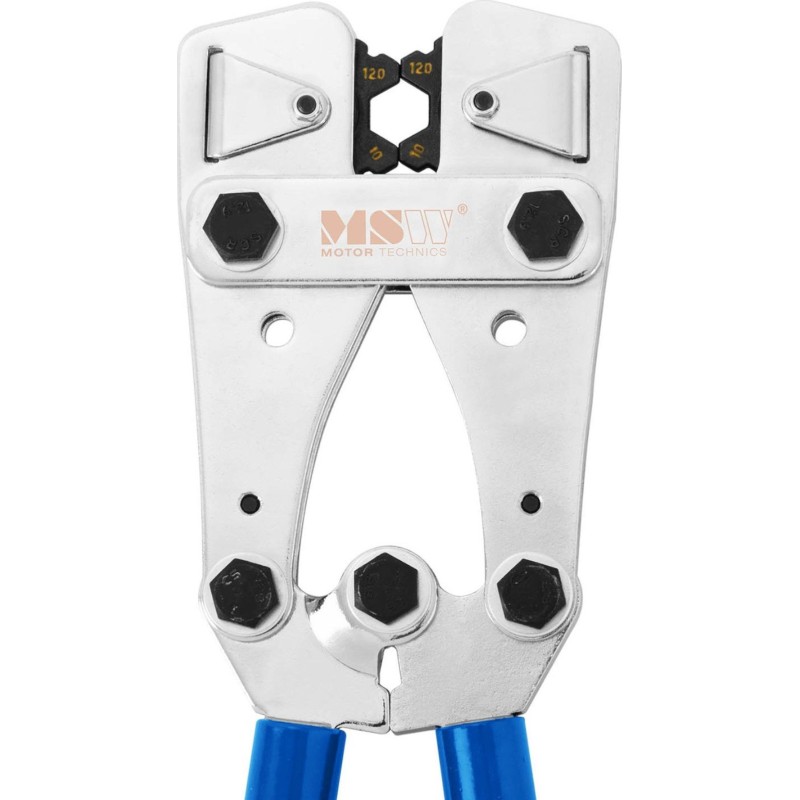 Zaciskarka do końcówek marki MSW pozwala na obróbkę tulejek z miedzi i aluminium łączących przewody elektryczne. Zakres zaciskania wynosi 6-120 mm. Konstrukcję praski w tym sześciokątną matrycę wykonano ze stali typu 400 Cr, wyróżnia się twardością na poziomie 42-45 HRC. Aby trwale połączyć dwa przewody wystarczy zdjąć z kabli warstwę ochronną, nałożyć na końcówkę tulejkę w odpowiednim rozmiarze i zacisnąć ją za pomocą szczypiec. Sześciokątna matryca zaciska łącznik równomiernie z każdej strony. Antypoślizgowe nakładki na rączkach zapewniają pewny chwyt narzędzia.